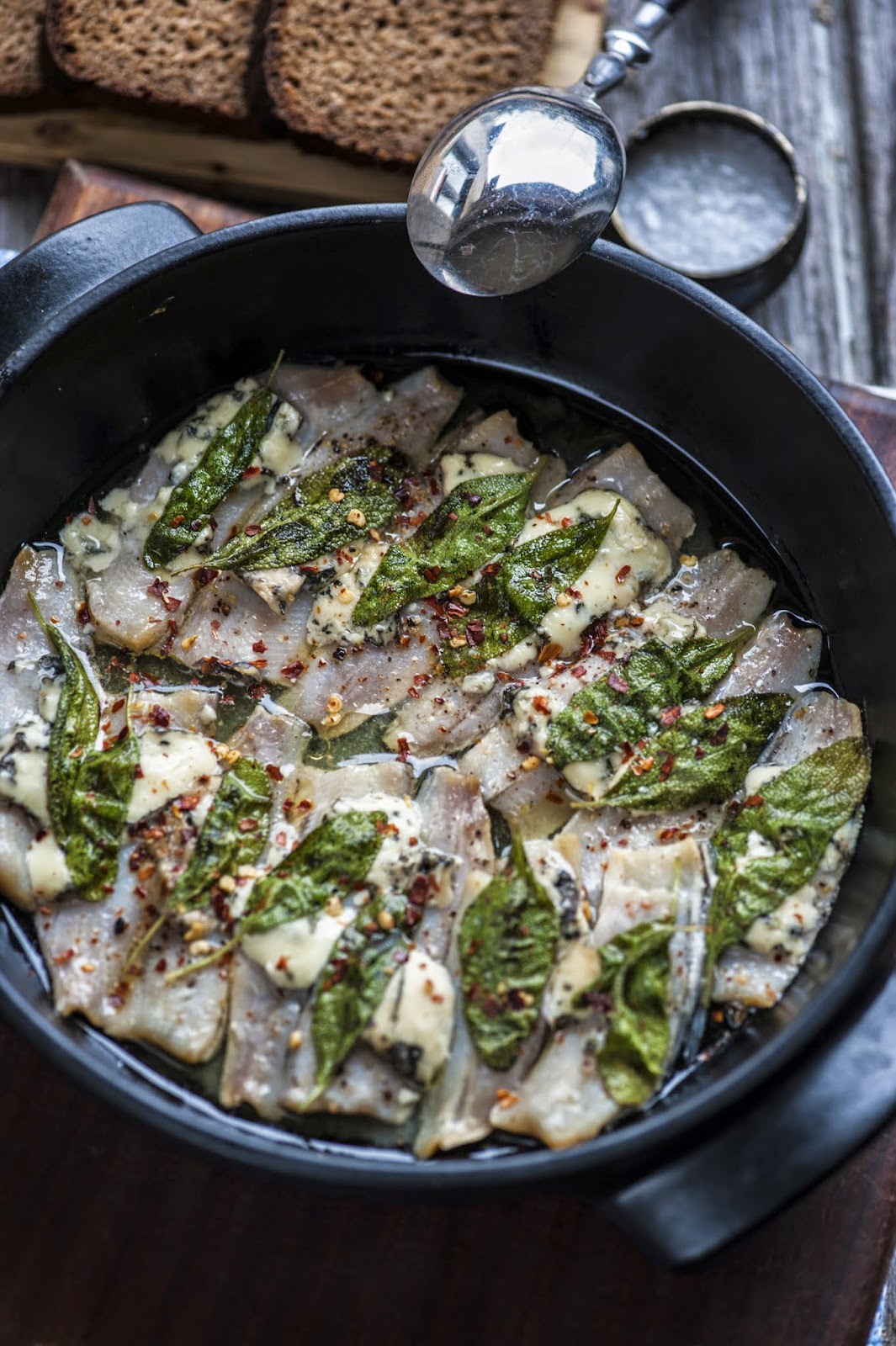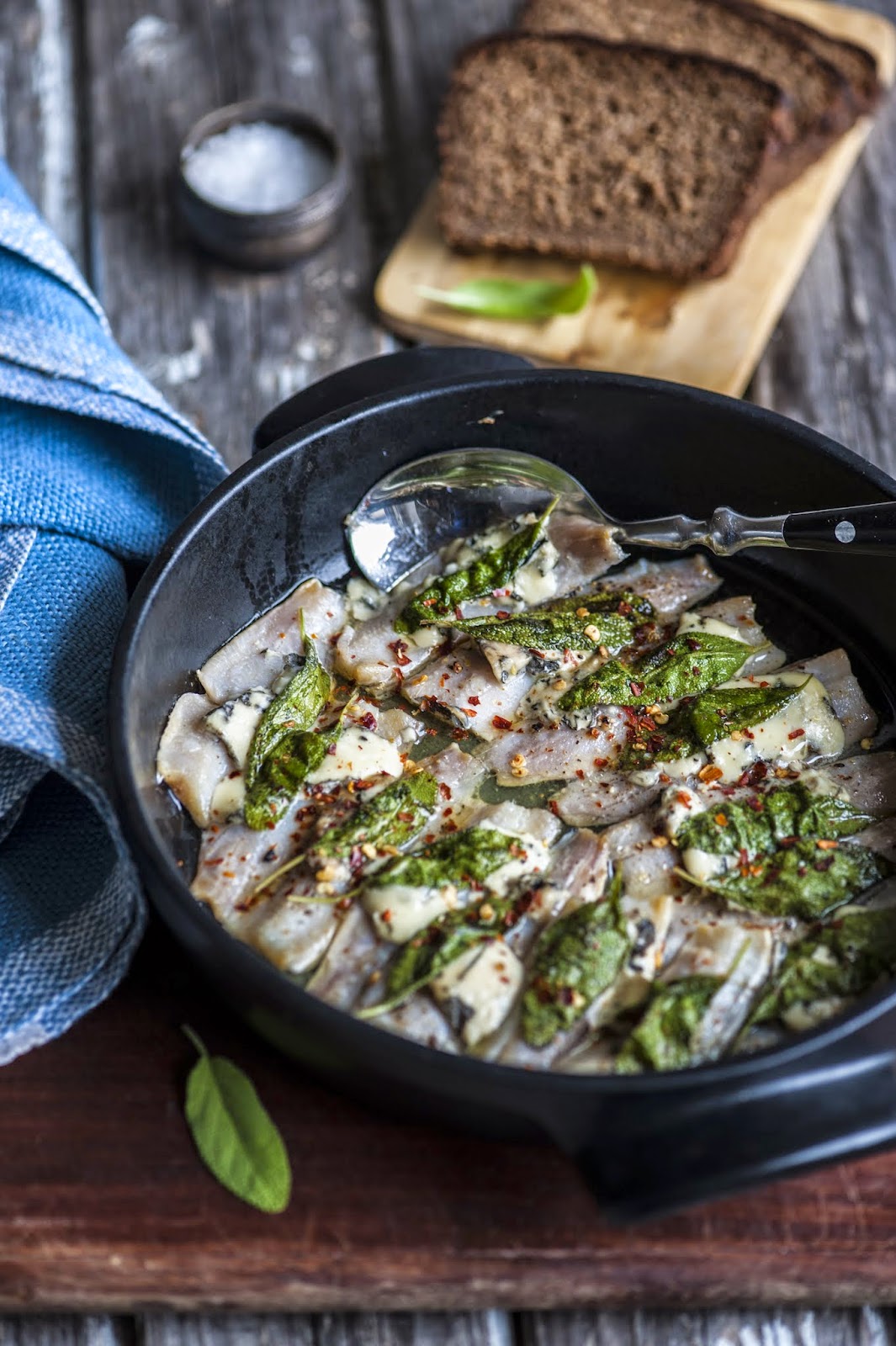 ja pipraga. Aseta igale räimefileele tükike sinihallitusjuustu, sinna peale