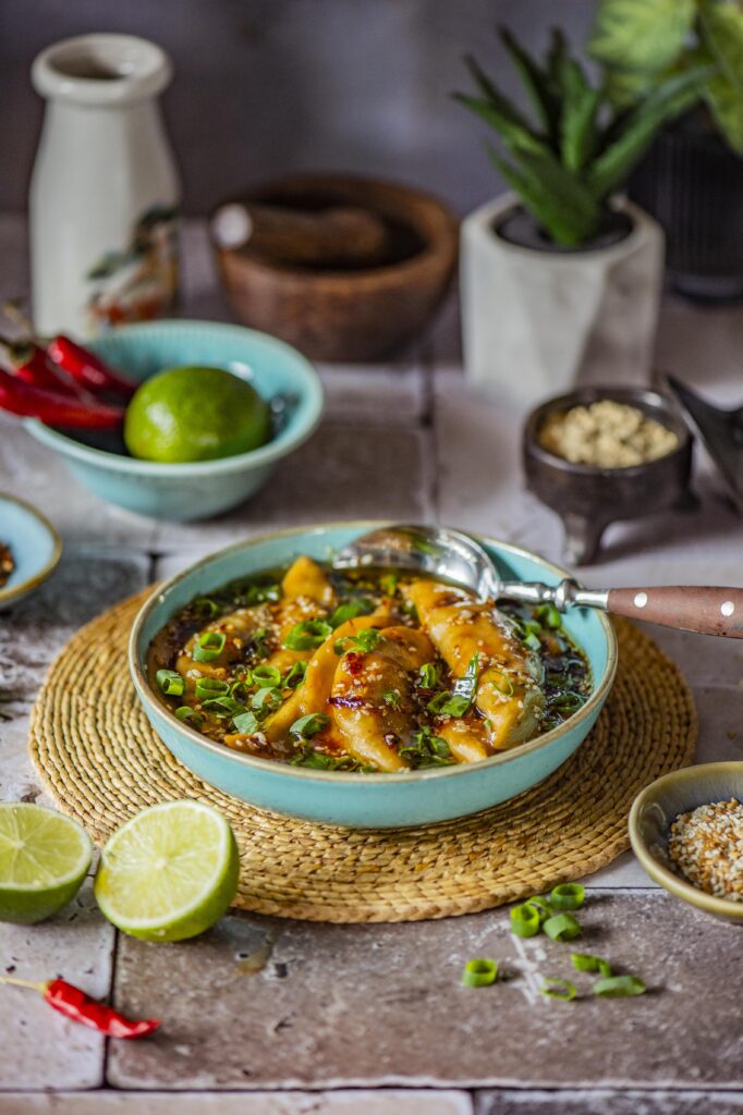 See on mõnusalt vürtsikas Aasia mõjutustega tummise leemega roog, kus staarirollis on Viči ricotta-, mozzarella-, ja spinatitäidisega pelmeenid. Valmistuskäigu juures on põnevam leeme valmistamine, kus tšillihelbed ja küüslauk tuleb kuuma õliga üle valada.
