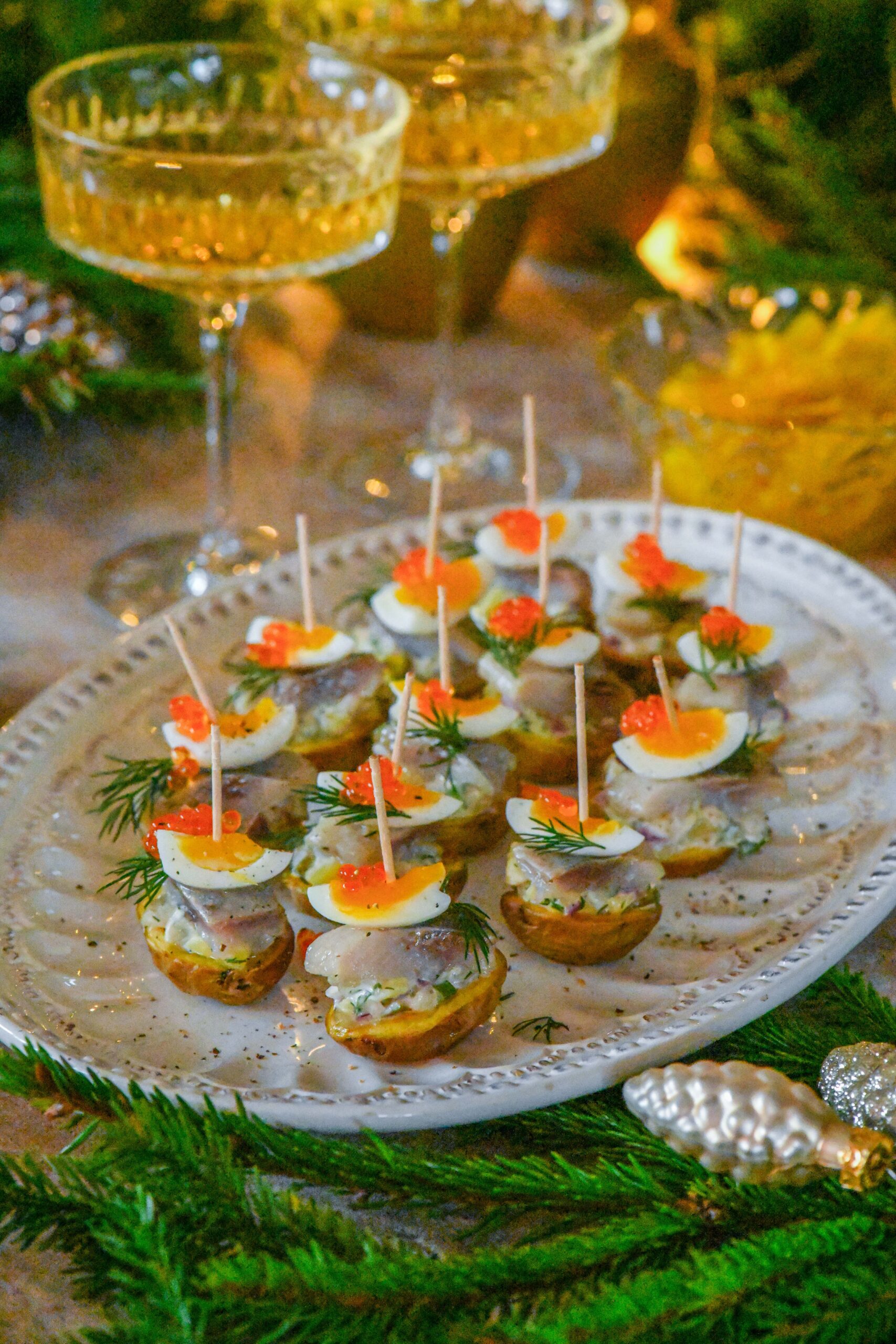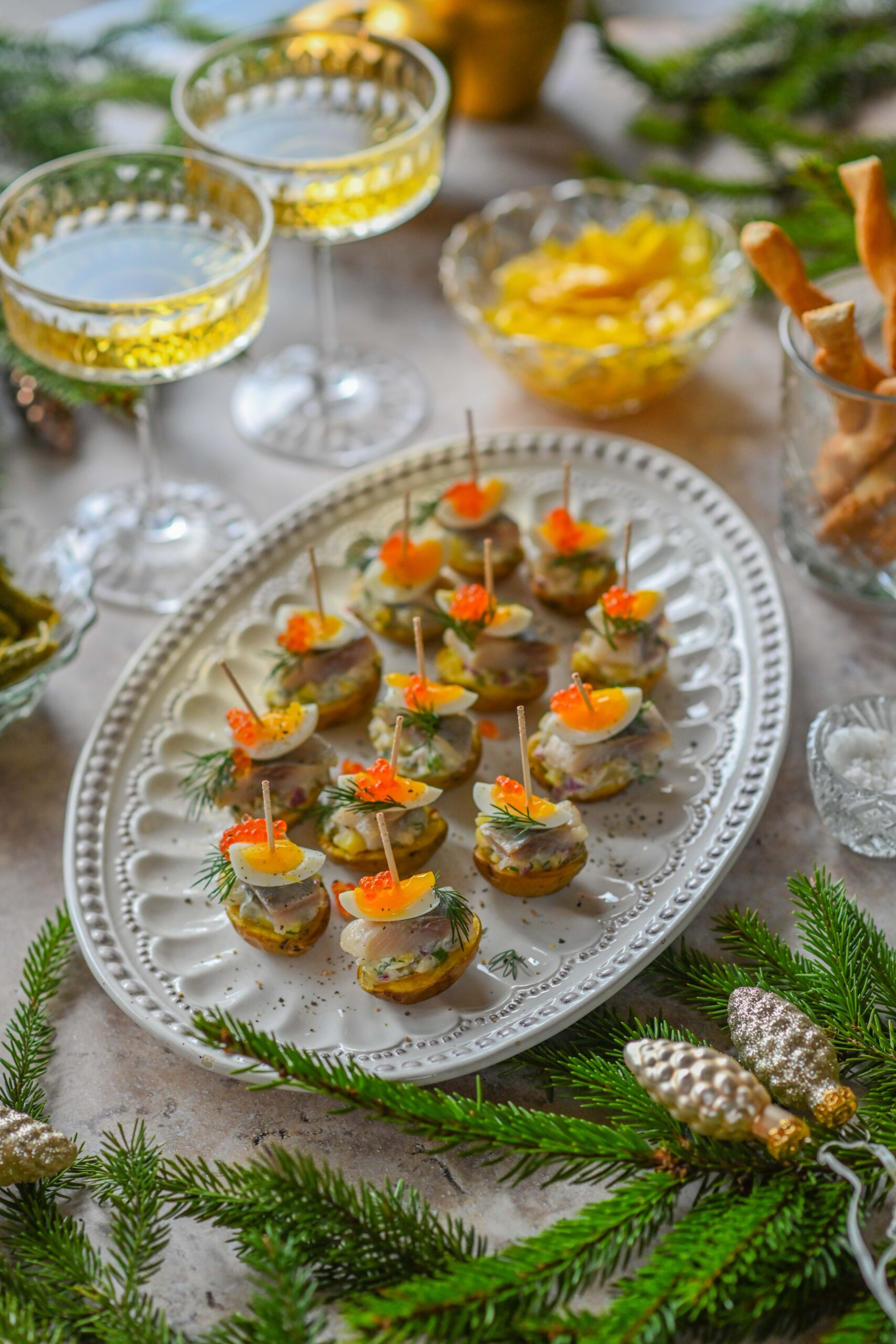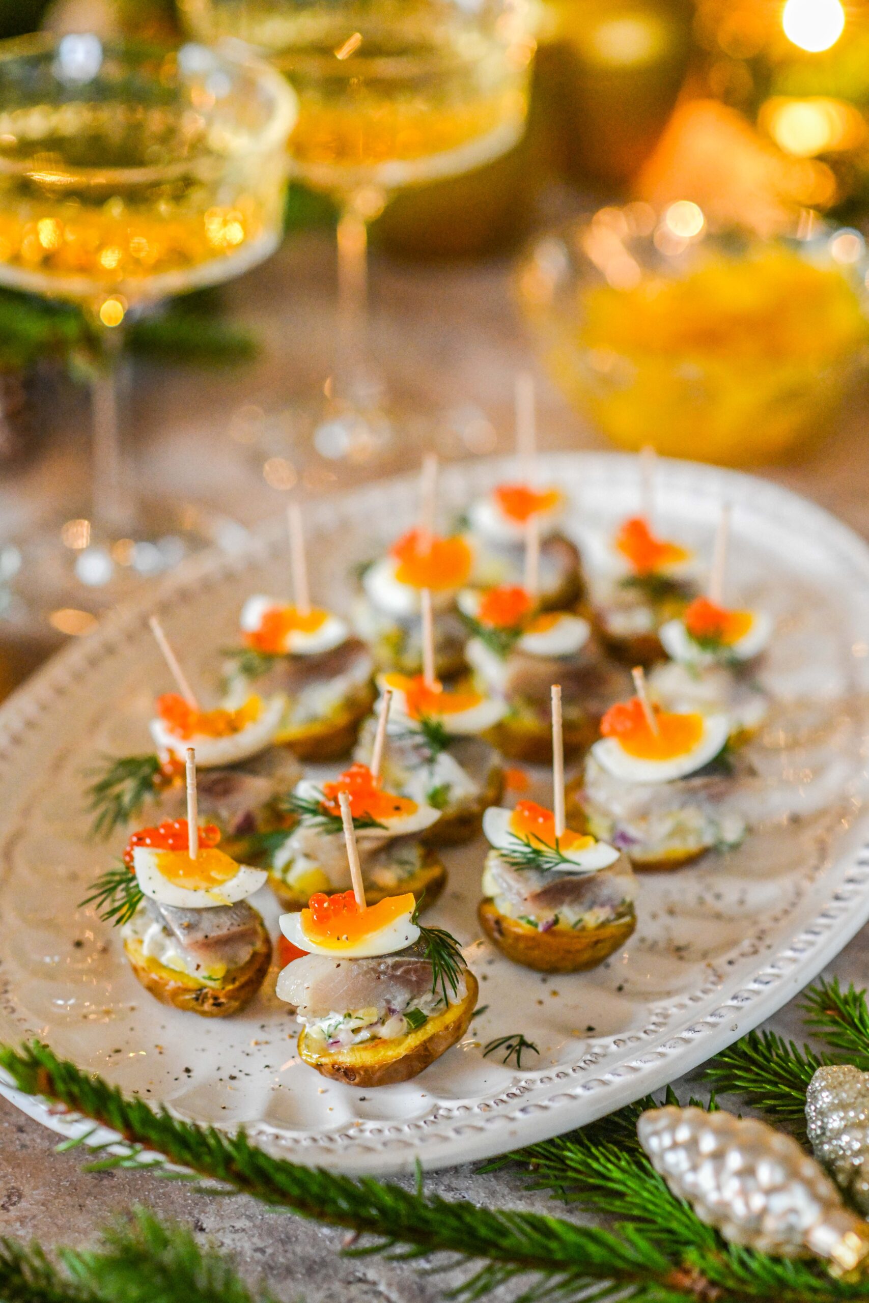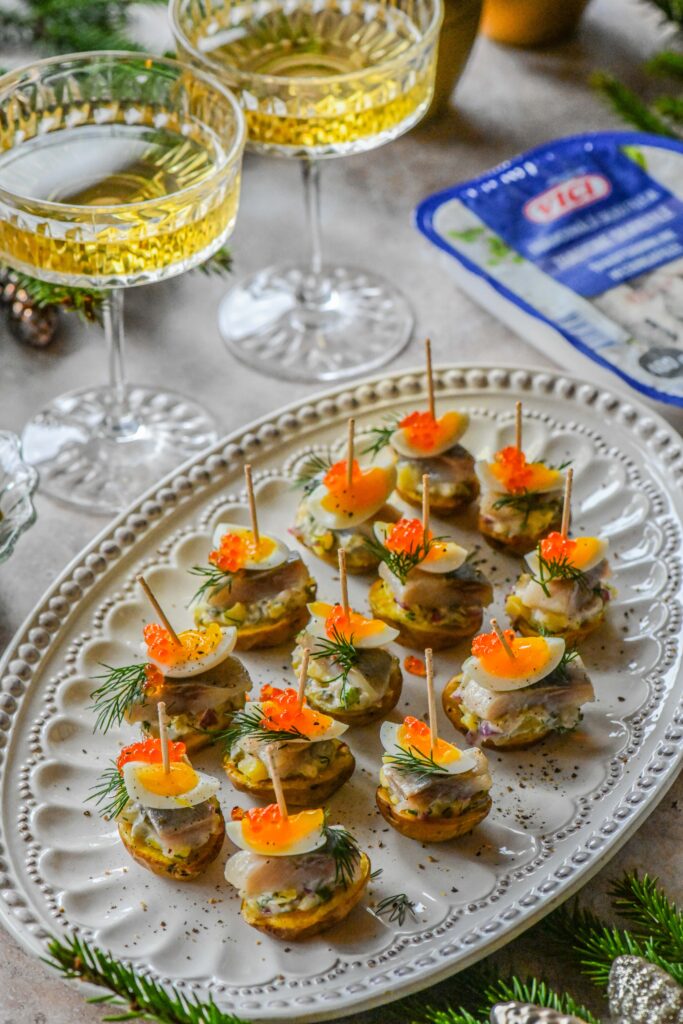- Haki välja uuristatud kartulisisu ja lisa sellele 1 hakitud heeringafilee, hakitud punane sibul ja hapukoor. Maitsesta soola ja pipraga ning lisa ka veidi sidrunimahla ja hakitud tilli. Sega kõik läbi ning täida sellega kuldseks küpsetatud kartulilootsikud. Aseta igale suupistele paraja suurusega heeringatükk ning poolitatud vutimuna. Kaunista tilliokstega ja pidulikkuse lisamiseks võid tõsta suupistele veel veidi kalamarja.
