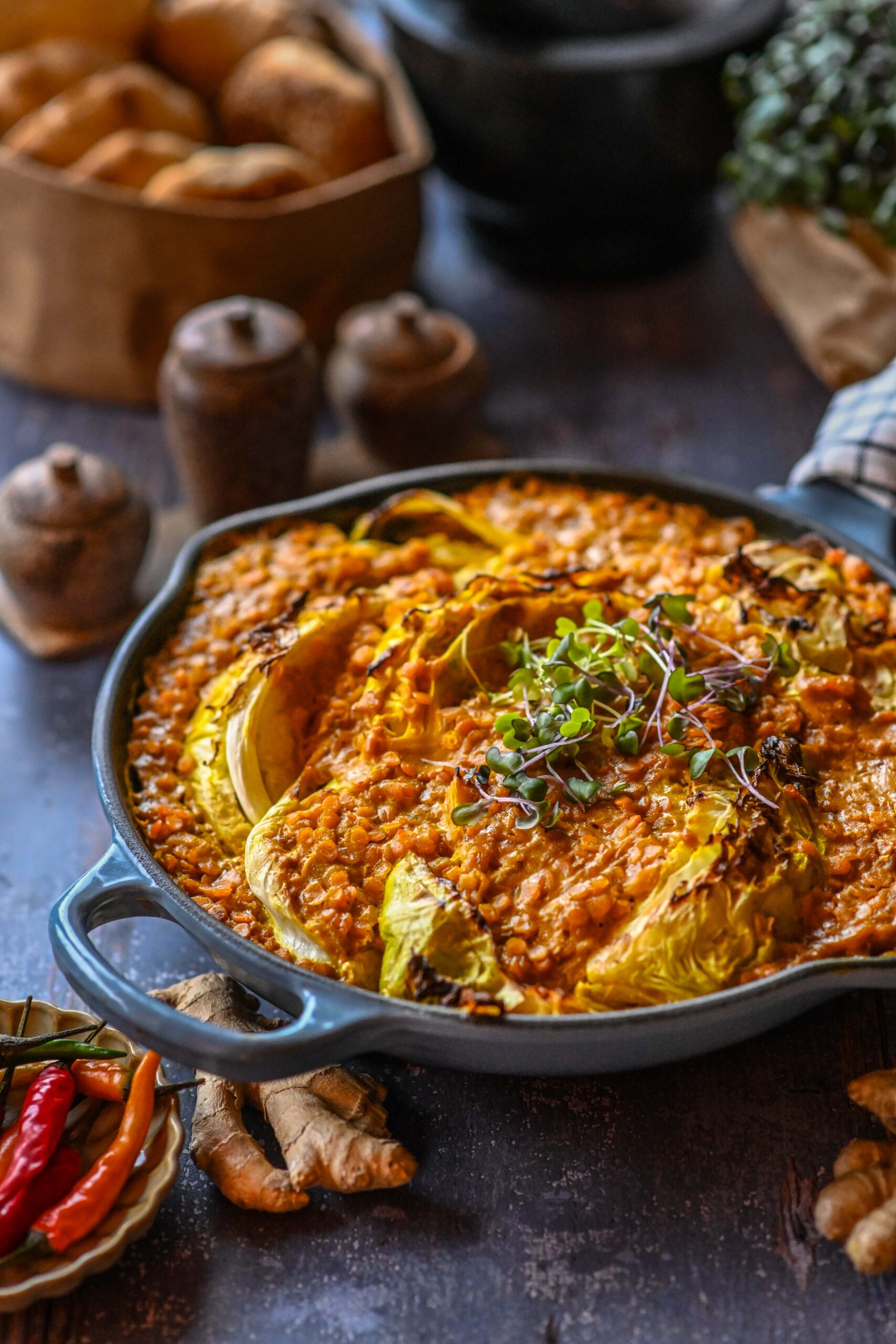- Kuumuta pannil õli ja prae sektoriteks lõigatud kapsast mõlemalt poolt, kuni see on kergelt pruunistunud. Maitsesta soola ja pipraga. Tõsta pannilt ära. Kuumuta pannil veel veidi õli ning hauta vaiksel kuumusel hakitud sibulat ning riivitud küüslauku ja ingverit 5-7 minutit. Lisa siis pannile kurkum ja vürtsköömned ja kuumuta läbi, kuni need muutuvad aromaatseks. Kalla pannile kookospiim ja köögiviljapuljong, sega läbi ja lisa vedeliku sisse ka läätsed. Kata kaanega ning hauta keskmisel kuumusel umbes 5 minutit. Tõsta nüüd pannile kapsasektorid tagasi, kasta neid kookospiimaga ja tõsta ahju180 kraadi juurde 15-20 minutiks. Peale 20 minutit peaksid läätsed olema peaaegu pehmed. Vajadusel lisa pannile veel veidi vett või puljongit, kasta kapsaid veel vedelikuga ja tõsta ahju temperatuur 200 kraadini ning küpseta pannitäit veel kümmekond minutit. Serveerides võid juurde pakkuda riisi ja lisada koriandrit.