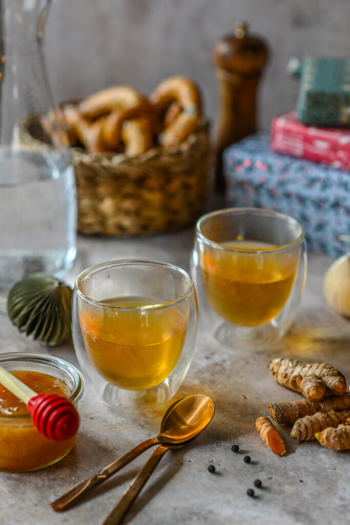 Viiluta või riivi kurkumijuur ja vala sellele kuum kraanivesi. Lase mõni minut tõmmata ja kurna. Jahuta jook 60 kraadini, seejärel lisa mesi ja soovi korral sidrunimahl. Lõpetuseks lisa näpuotsaga värskelt jahvatatud musta pipart.