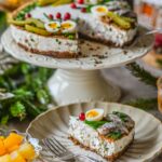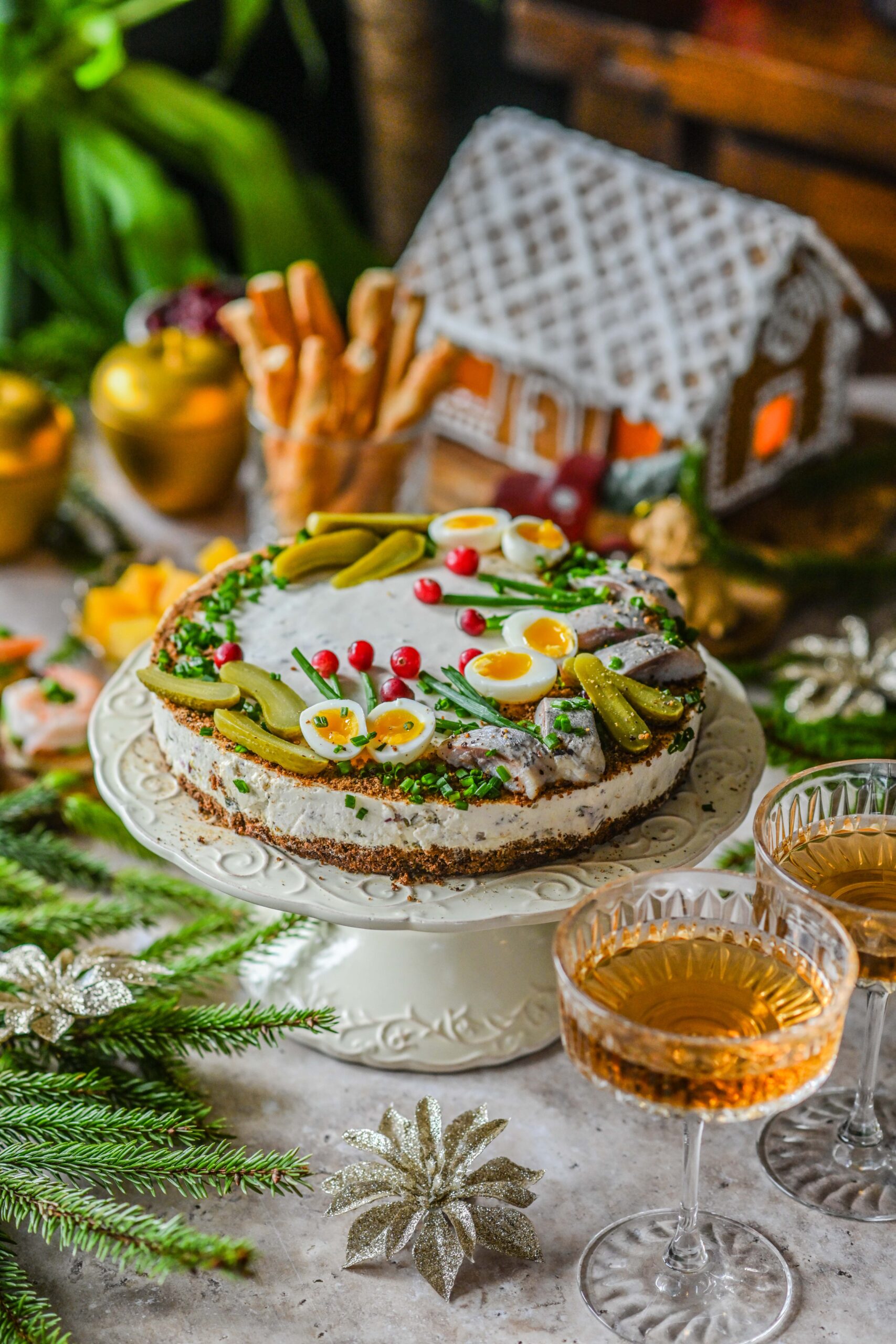 - Enne serveerimist tõmba noaga koogi servad vormi küljest lahti. Kaunista riivleiva, vutimunade, heeringatükkide, murulaugu ja jõhvikatega.