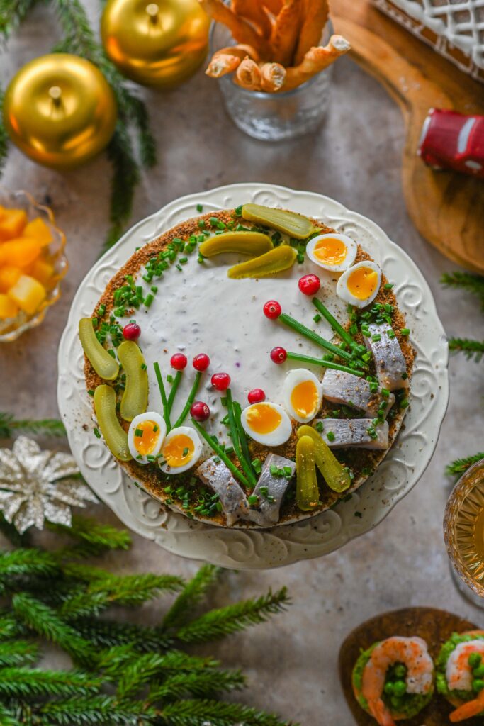 - Kaunistamiseks riivleiba heeringat, vutimune, murulauku, jõhvikaid