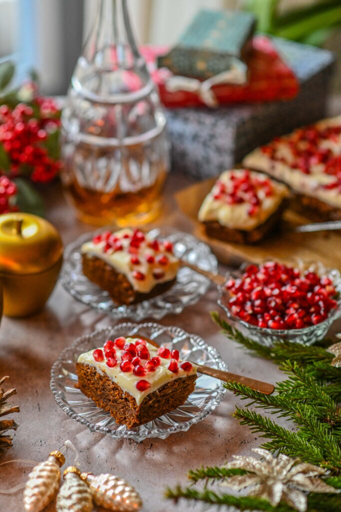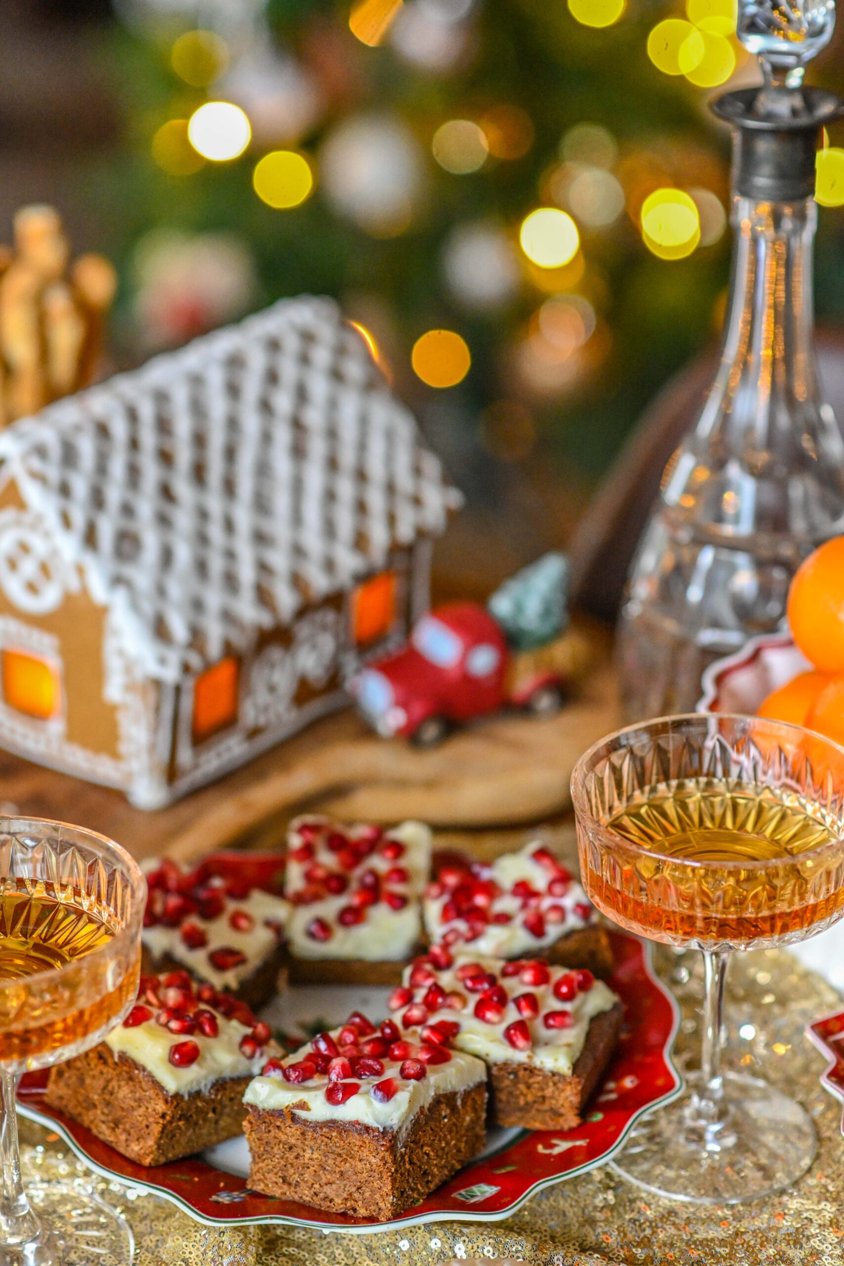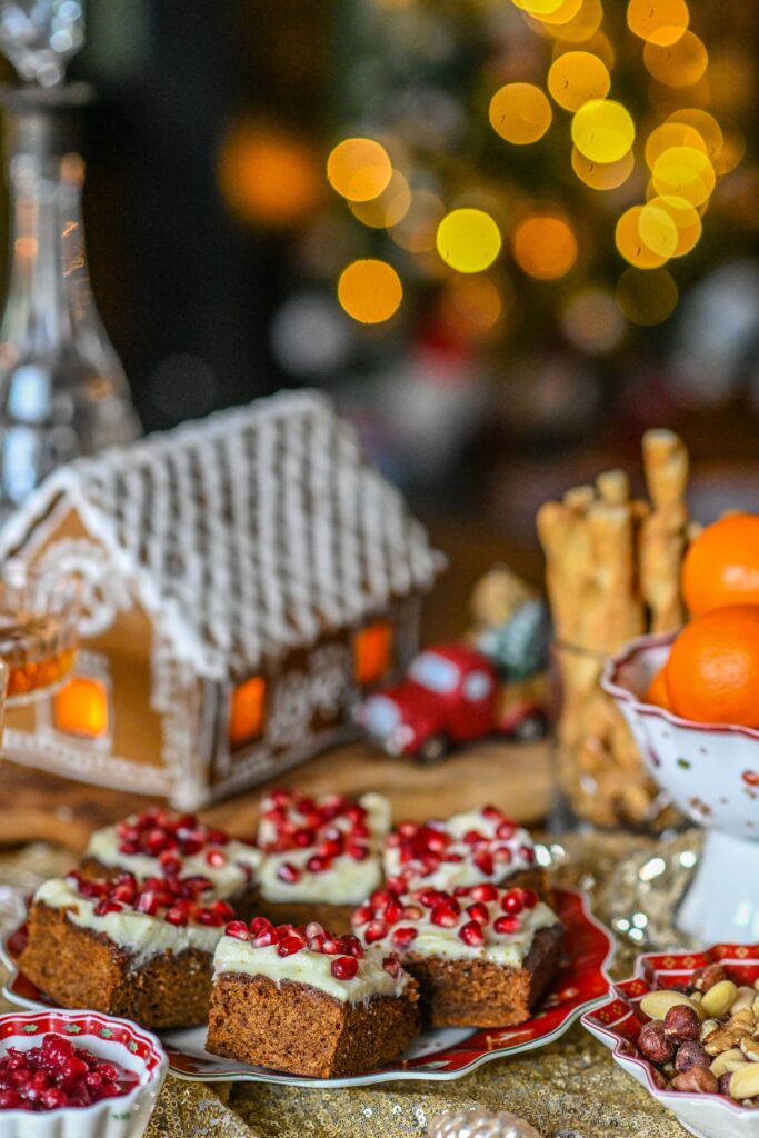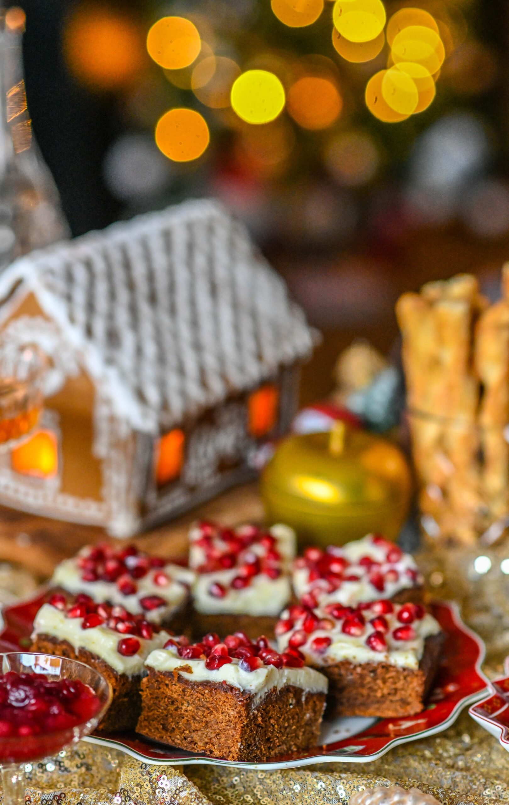 Klassikalisele browniele on siin lisatud vürtsi piparkoogimaitseainega, mis tavapärase maitsebuketi koheselt jõulusemaks muudab. Kergelt hapuka alatooniga kreemine toorjuustuglasuur koos granaatõunaseemnetega aitab brownie külluslikku maitset tasakaalu sättida.