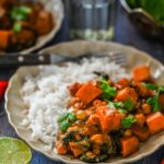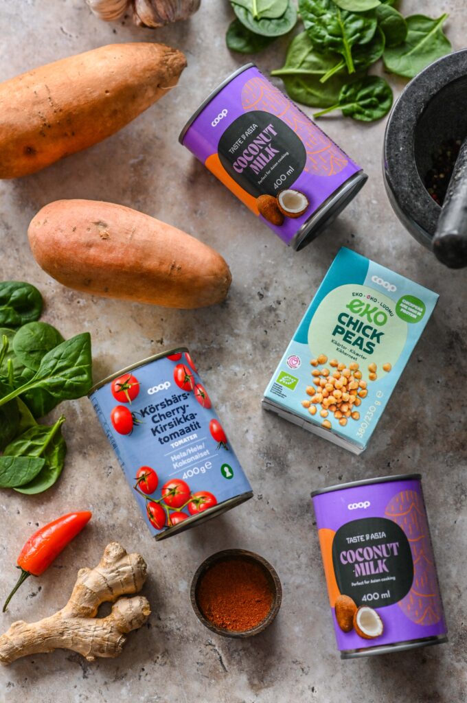 - Lisa siis pannile kurnatud kikerherned ja tükeldatud bataat. Sega läbi ja lisa ka vürtsid ehk garam masala, karripulber, suitsutatud paprika pulber ja vürtsköömneid. Kuumuta kõik läbi umbes minutijagu, kuni pannitäis muutub aromaatseks. Lisa siis kookospiim ja sega kõik läbi. Lase karril keema tõusta, alanda siis kuumust ja hauta pannitäit 20-30 minutit, kuni bataat on pehme. Vajadusel lisa pannile veidi vett või köögiviljapuljongit, kui karri liiga kuivaks tõmbab.