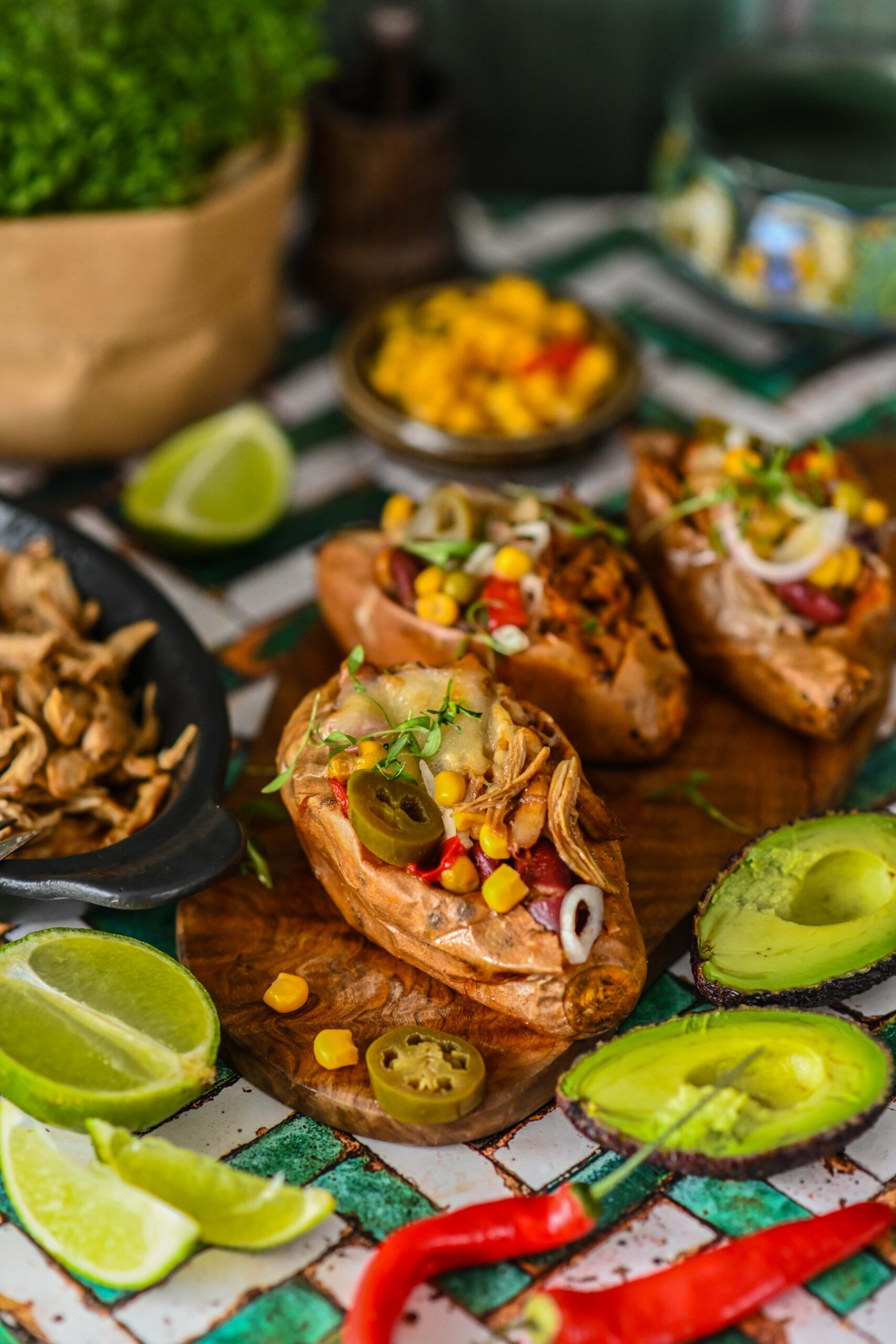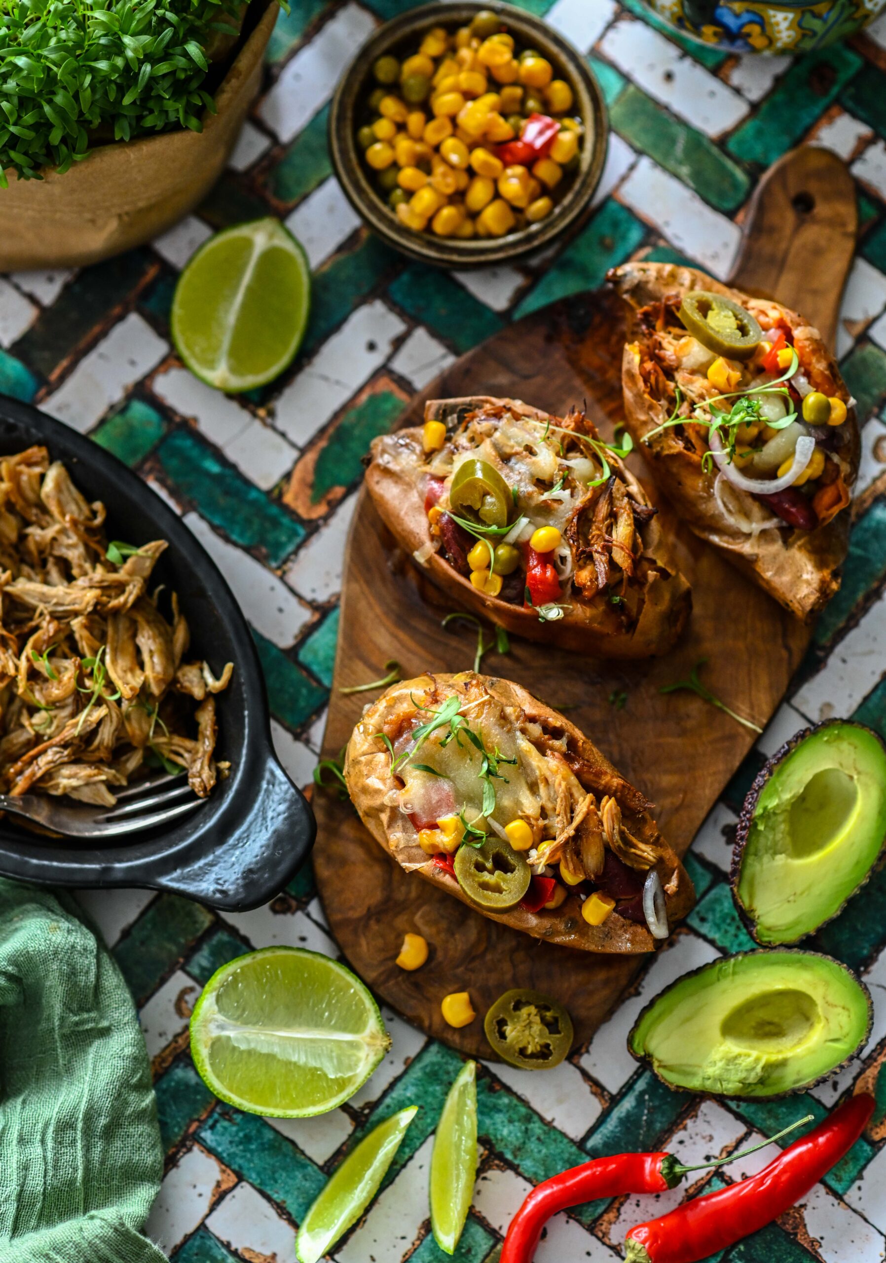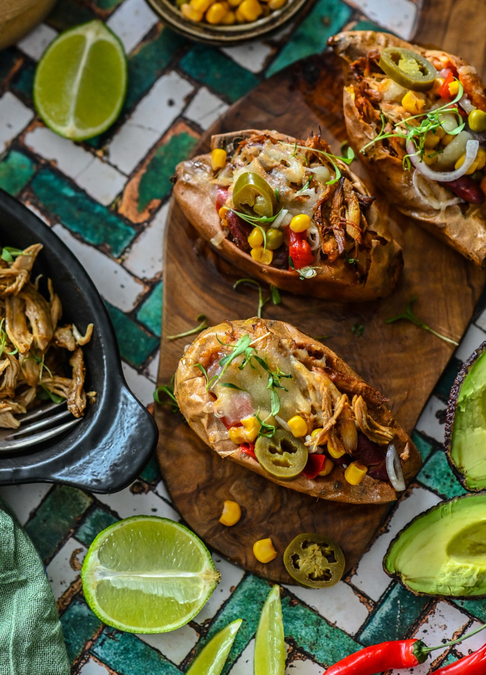 Tervelt küpsetatud ja täidetud bataat on omamoodi mõnus mugavusroog, mis annab võimaluse täidistega üsna vabalt improviseerida. Piltlikult on tegemist külmkapikoristusega, kus bataadi sisse võib sättida just neid toite, mis kapis ärasöömist ootamas või siis karbipõhja õnnetult oma hetke igatsema jäänud. Siin variandil on kasutatud rebitud kana ja mehhikopäraseid komponente nagu oad, mais, jalapeno, juust, sibul, avokaado. Rebitud kana võib teha ise, aga tegelikult saab siin täidises ära kasutada ka eelmisest päevast järele jäänud kana või muu liha või siis kasutada grillkana, mille saab samamoodi kiudupidi lahti rebida.