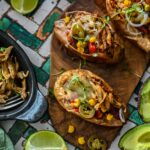 Laaditud bataat rebitud kana ja mehhikopärase täidisega