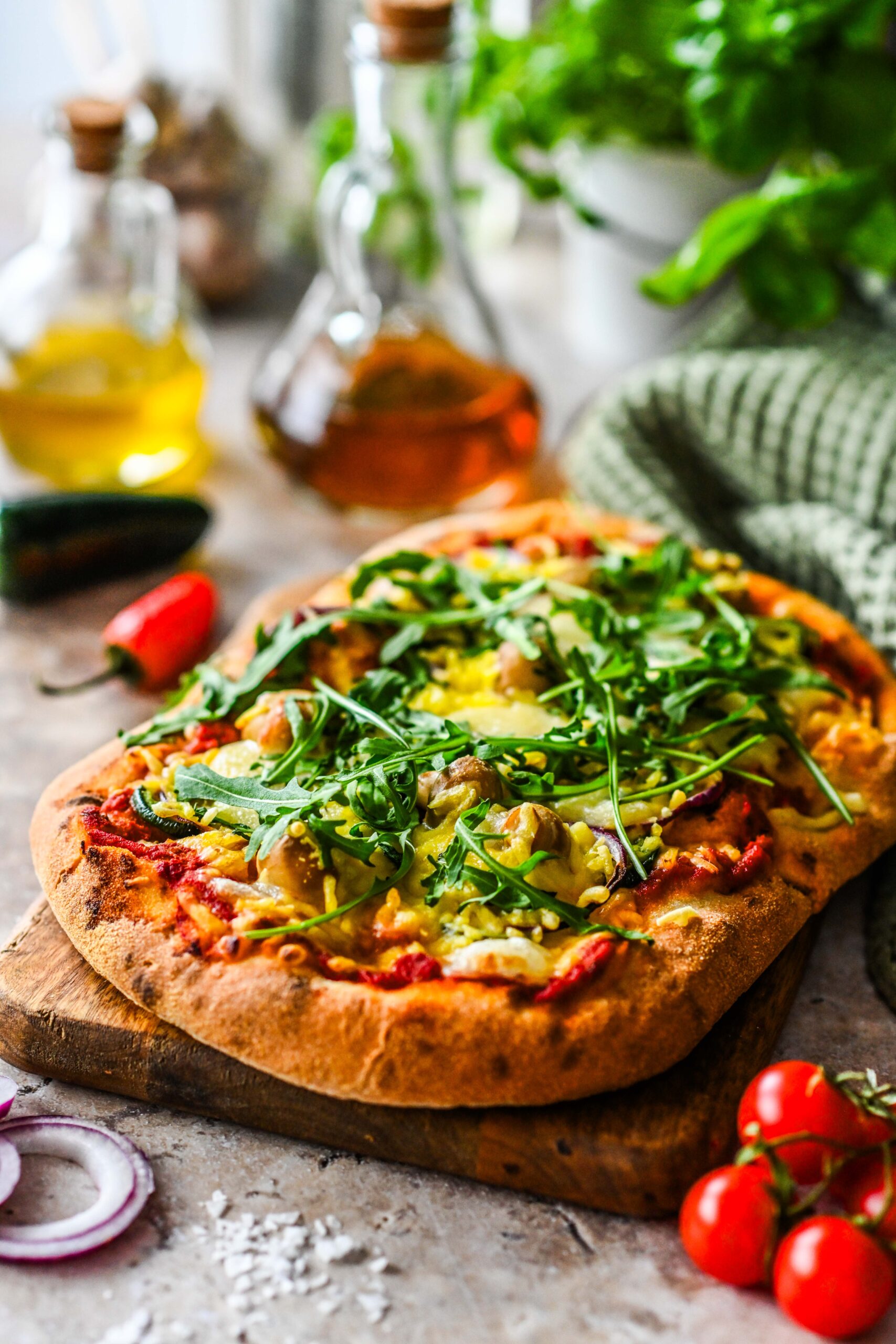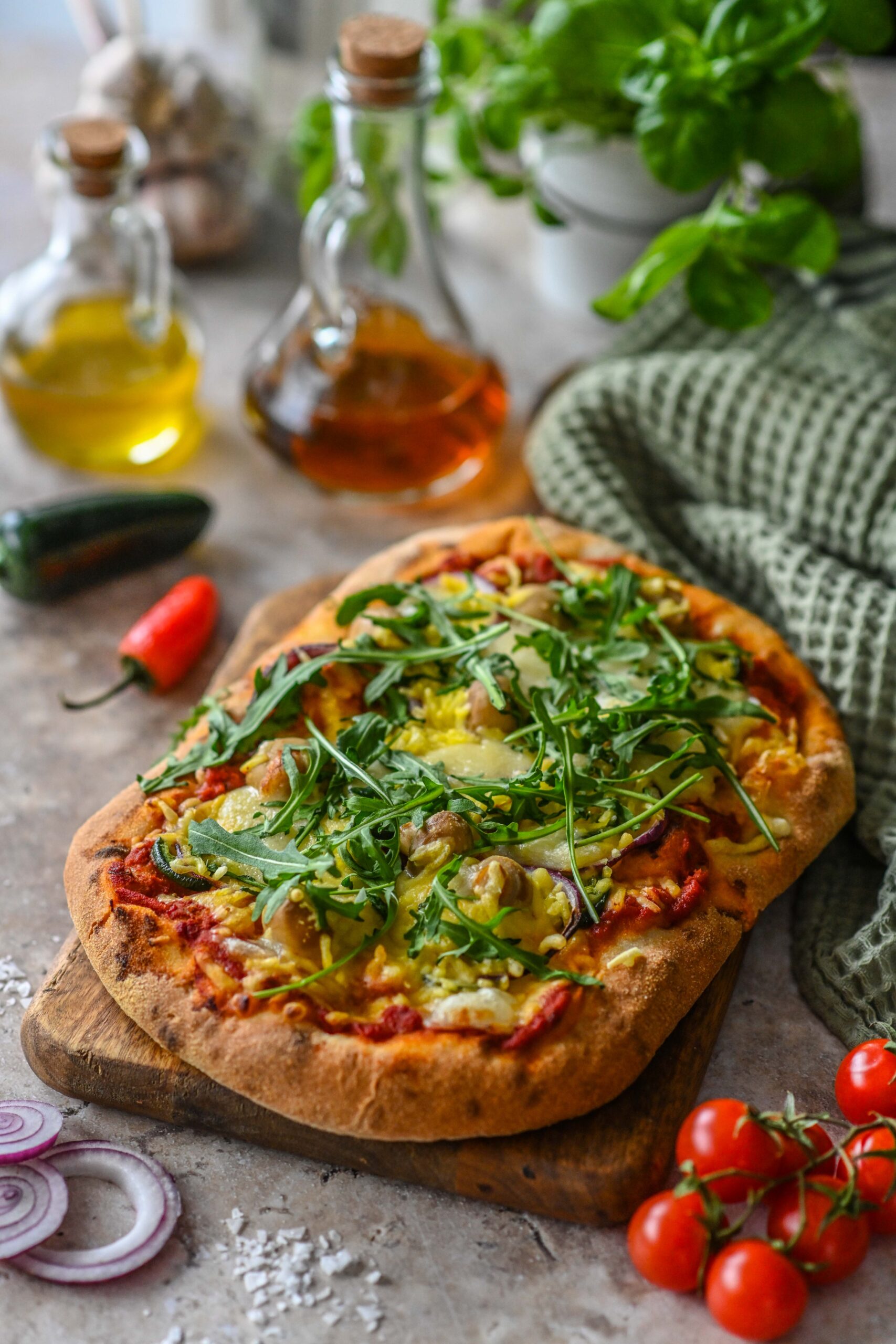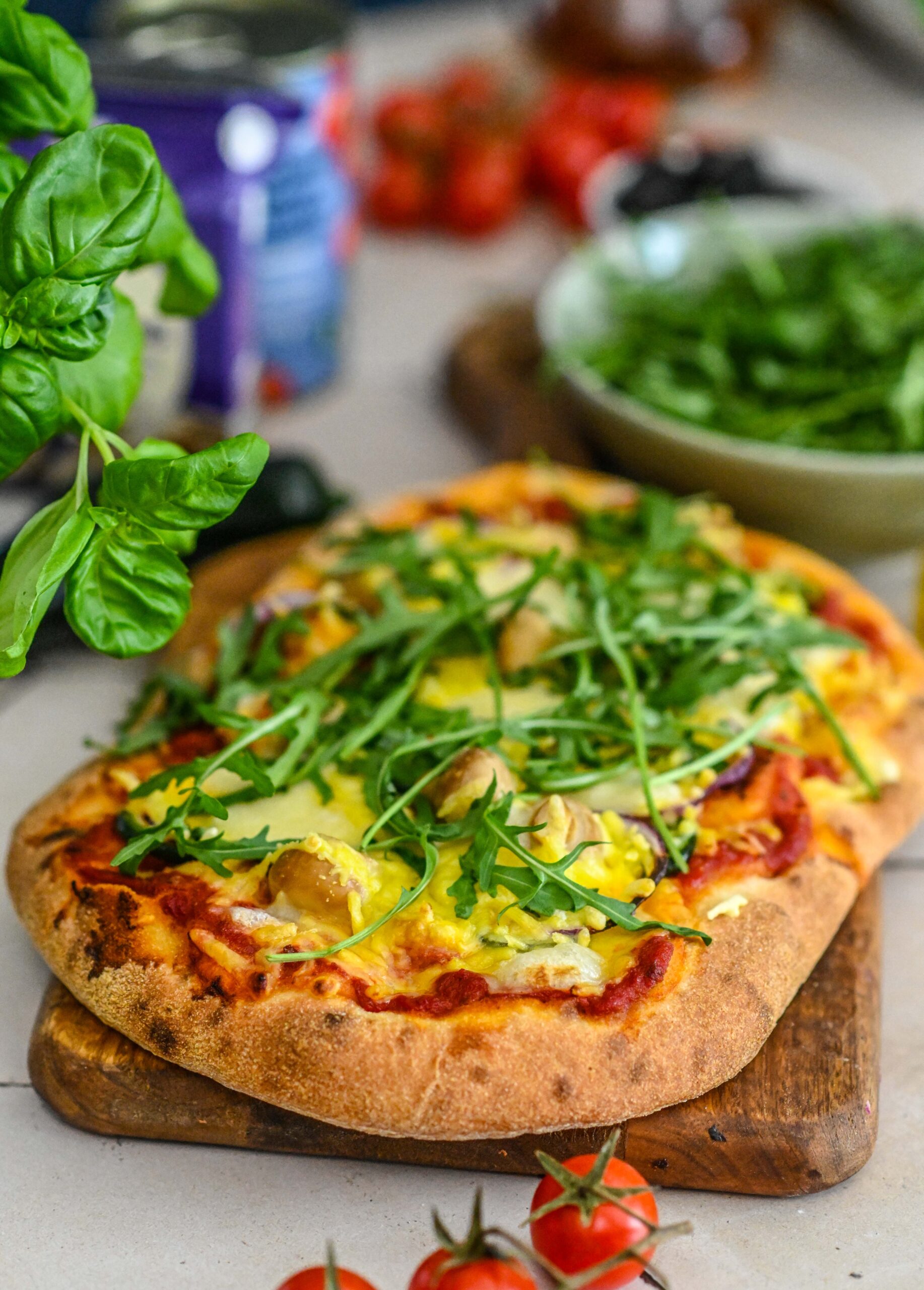 - Määri pinsapõhjale tomatikastet. Lisa sinna ka viilutatud jalapeno, sibularattad ja seened. Laota peale riivitud taimset juustu. Tõsta ahju 220 kraadi juurde 5-7 minutiks. Tõsta siis ahjust, laota peale värsket rukolat ja/või basiilikut. Naudi soojalt.