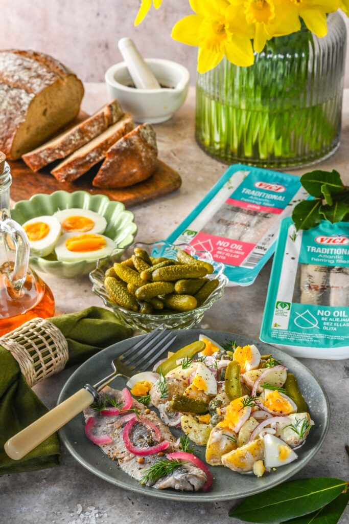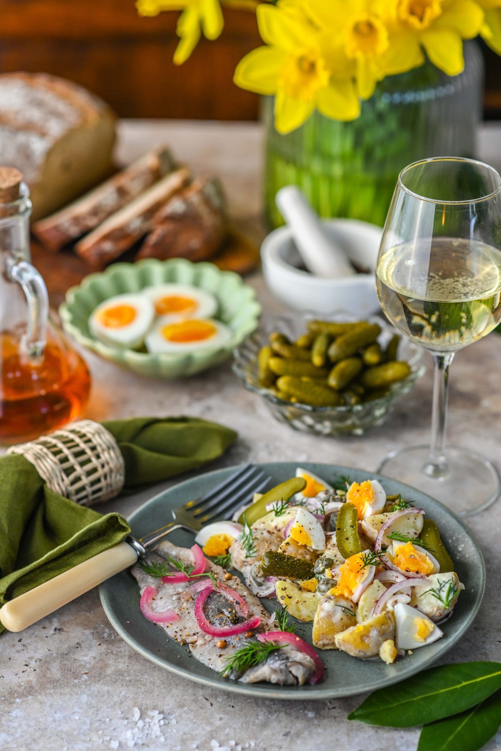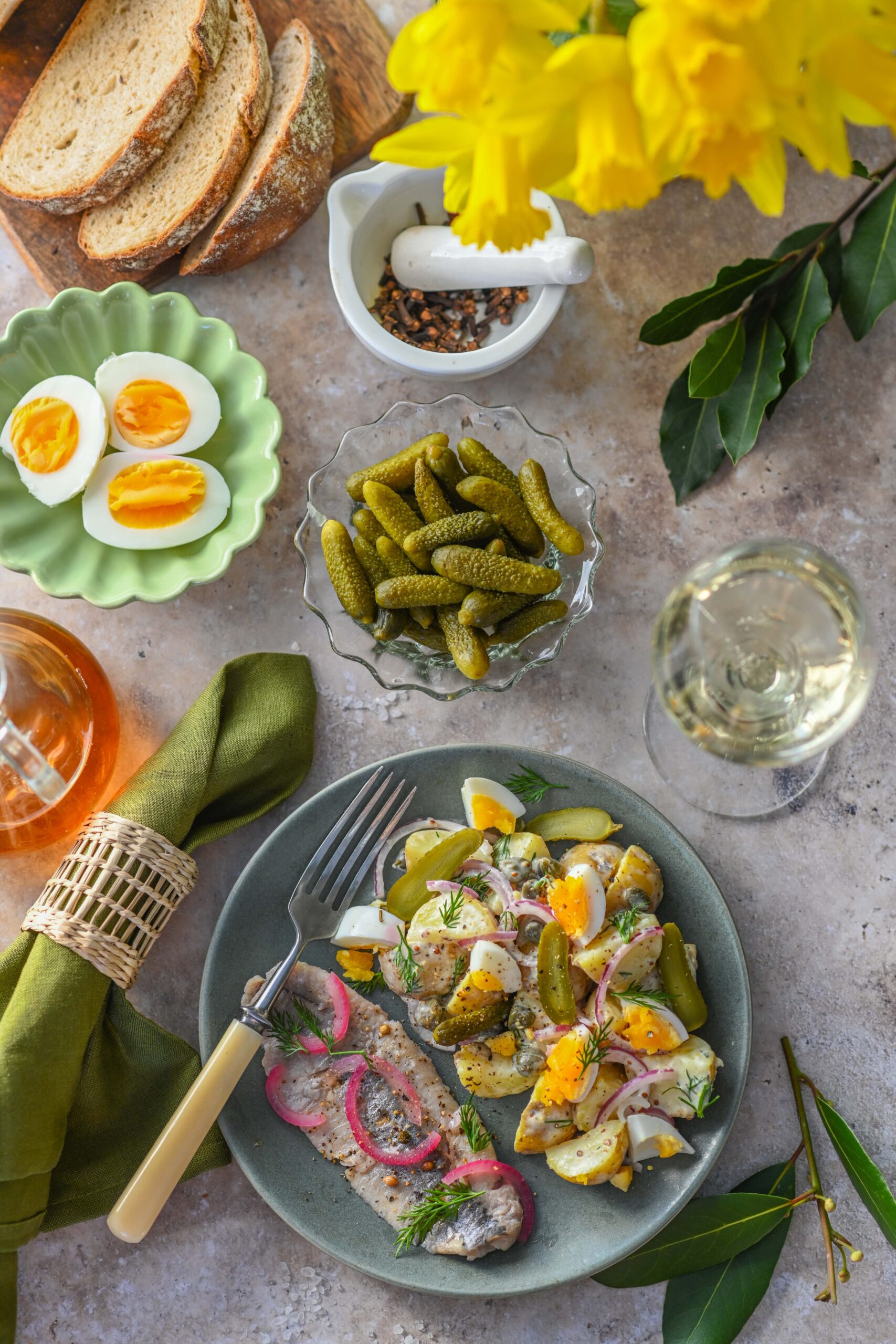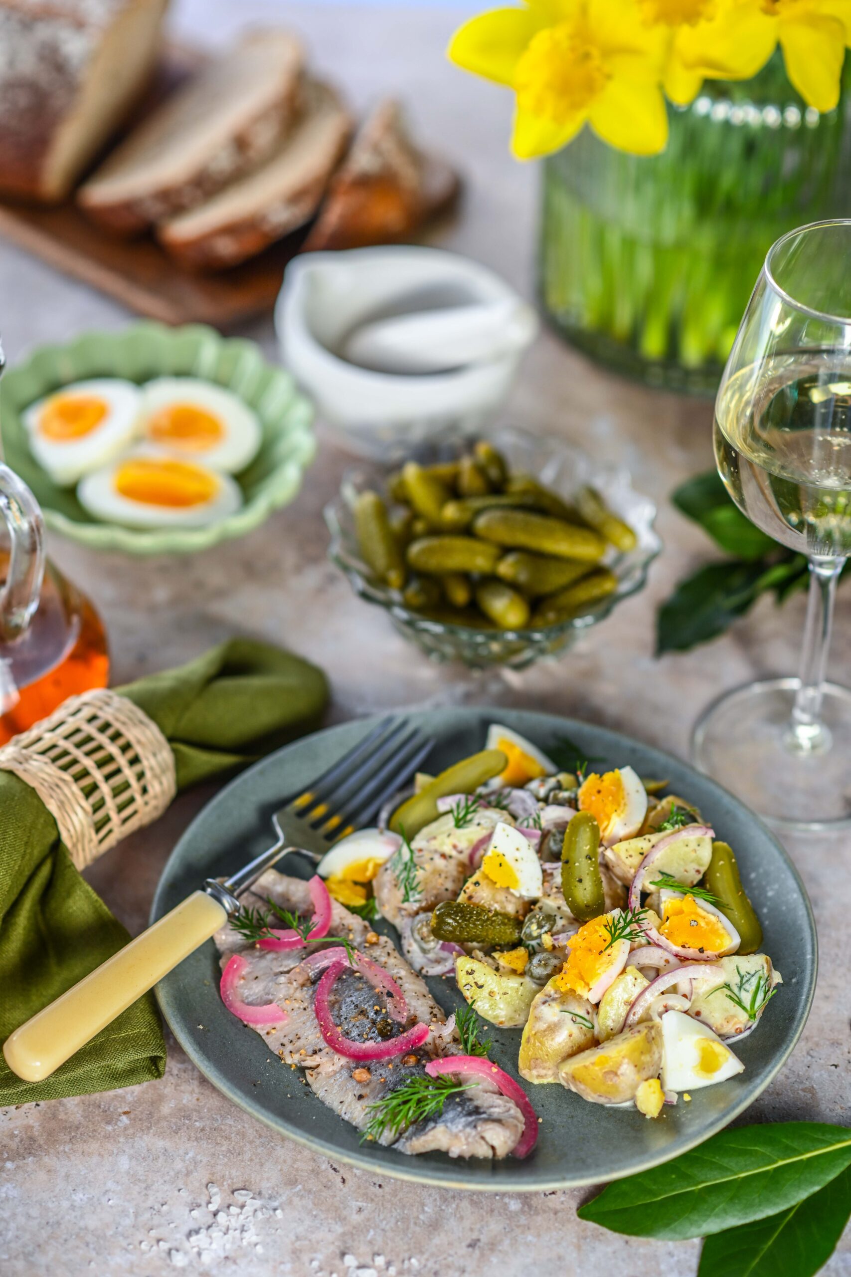 - Lisa juurde kartuli-munasalat, mille valmistamiseks sega esmalt valmis kastme ained ehk majonees, sinep ja veidike marineeritud kurgi vedelikku. Maitsesta kaste soola ja pipraga. Tõsta kaussi kartul, tükeldatud keedumuna, marineeritud kurk, sibul ja kapparid. Kalla peale kaste ning sega kõik läbi. Serveeri koos valges veinis pošeeritud heeringaga.