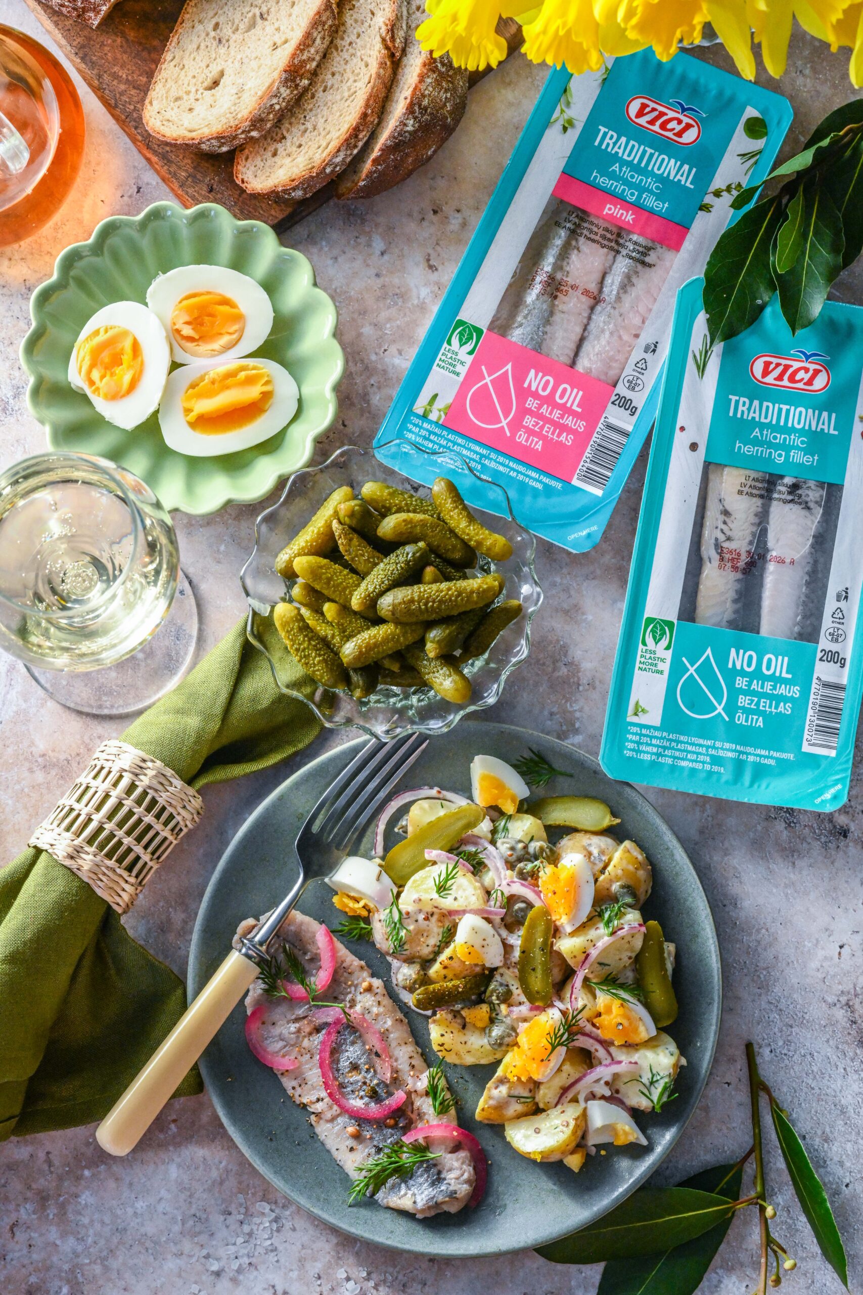 Valges veinis pošeeritud heeringafilee sinepise kartulisalatiga