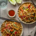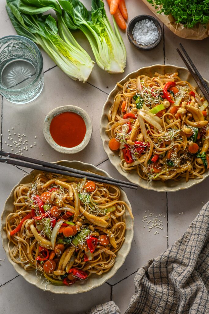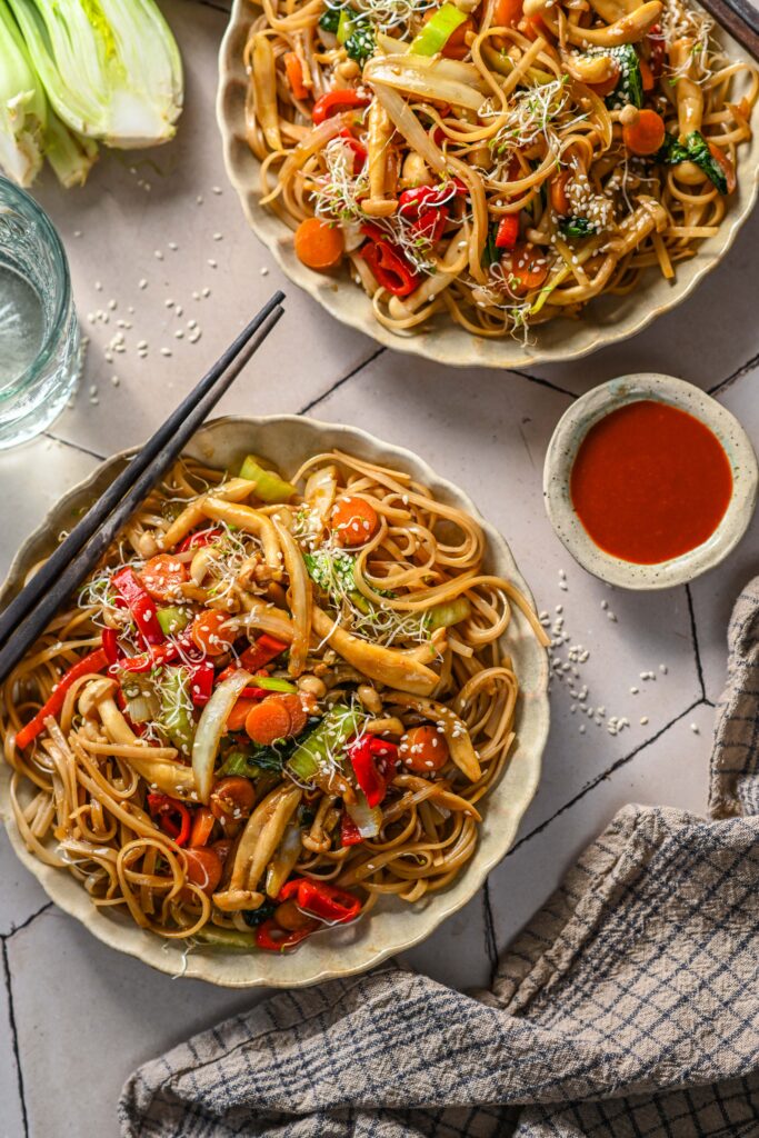 - Kalla pannile kaste (sega kaste enne pannile lisamist läbi, et tärklis ei oleks põhja vajunud) ja kuumuta, kuni kaste pakseneb. Lisa nüüd pannile ka riisinuudlid ja sega roog kõik läbi nii, et ka nuudlid oleksid kastmega kaetud. Tõsta taldrikutele ning puista peale seesamiseemneid ning idusid. Serveeri juurde sriracha kastet, et roale veel särtsukust lisada.
