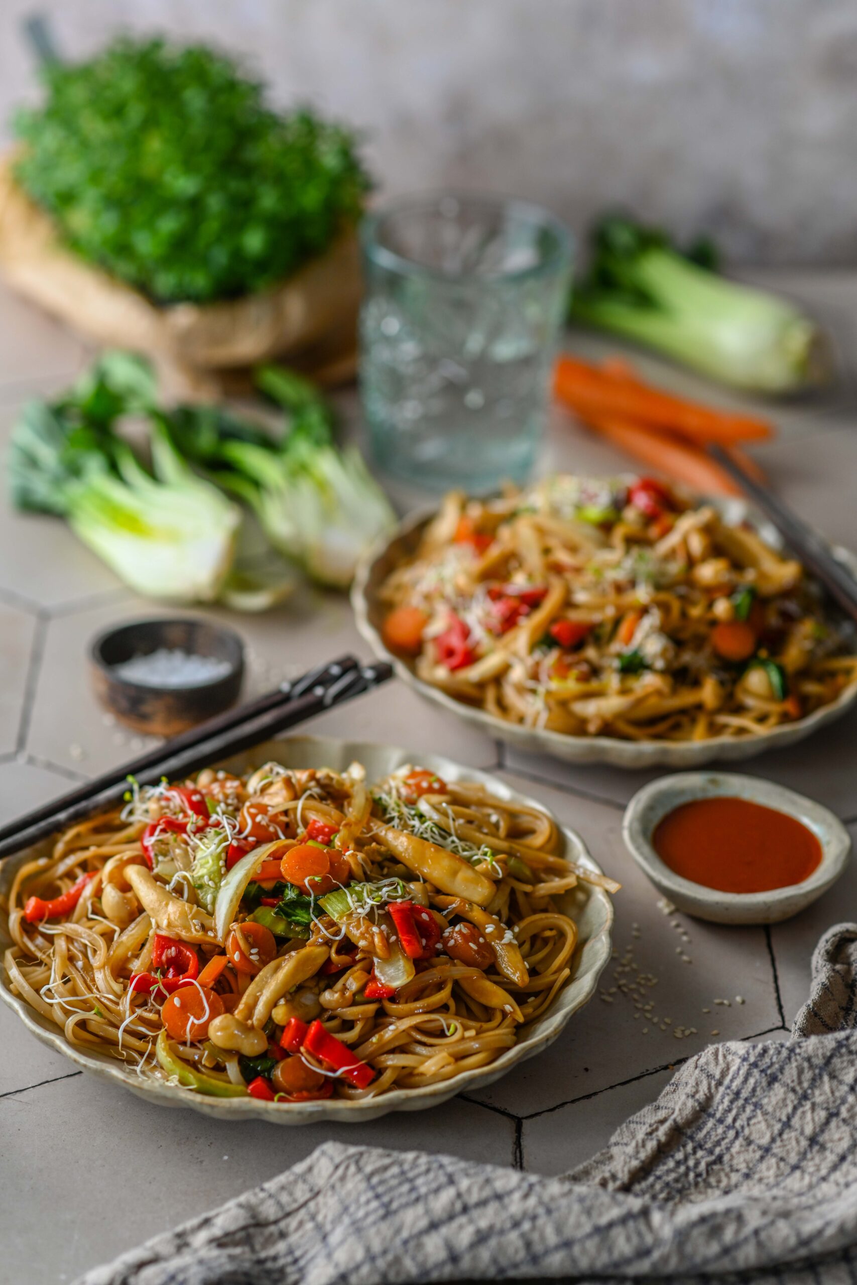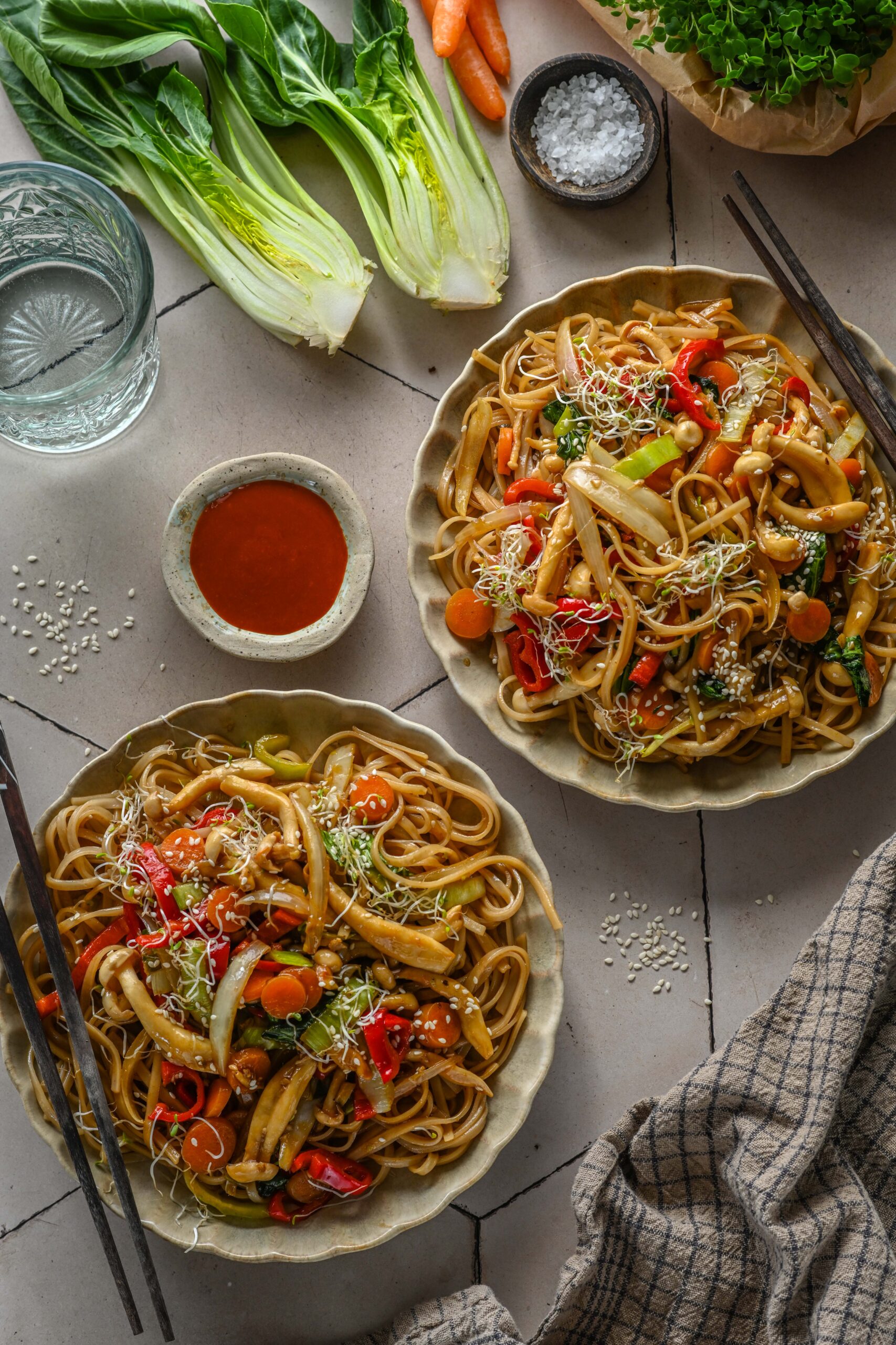 - Kalla pannile kaste (sega kaste enne pannile lisamist läbi, et tärklis ei oleks põhja vajunud) ja kuumuta, kuni kaste pakseneb. Lisa nüüd pannile ka riisinuudlid ja sega roog kõik läbi nii, et ka nuudlid oleksid kastmega kaetud. Tõsta taldrikutele ning puista peale seesamiseemneid ning idusid. Serveeri juurde sriracha kastet, et roale veel särtsukust lisada.