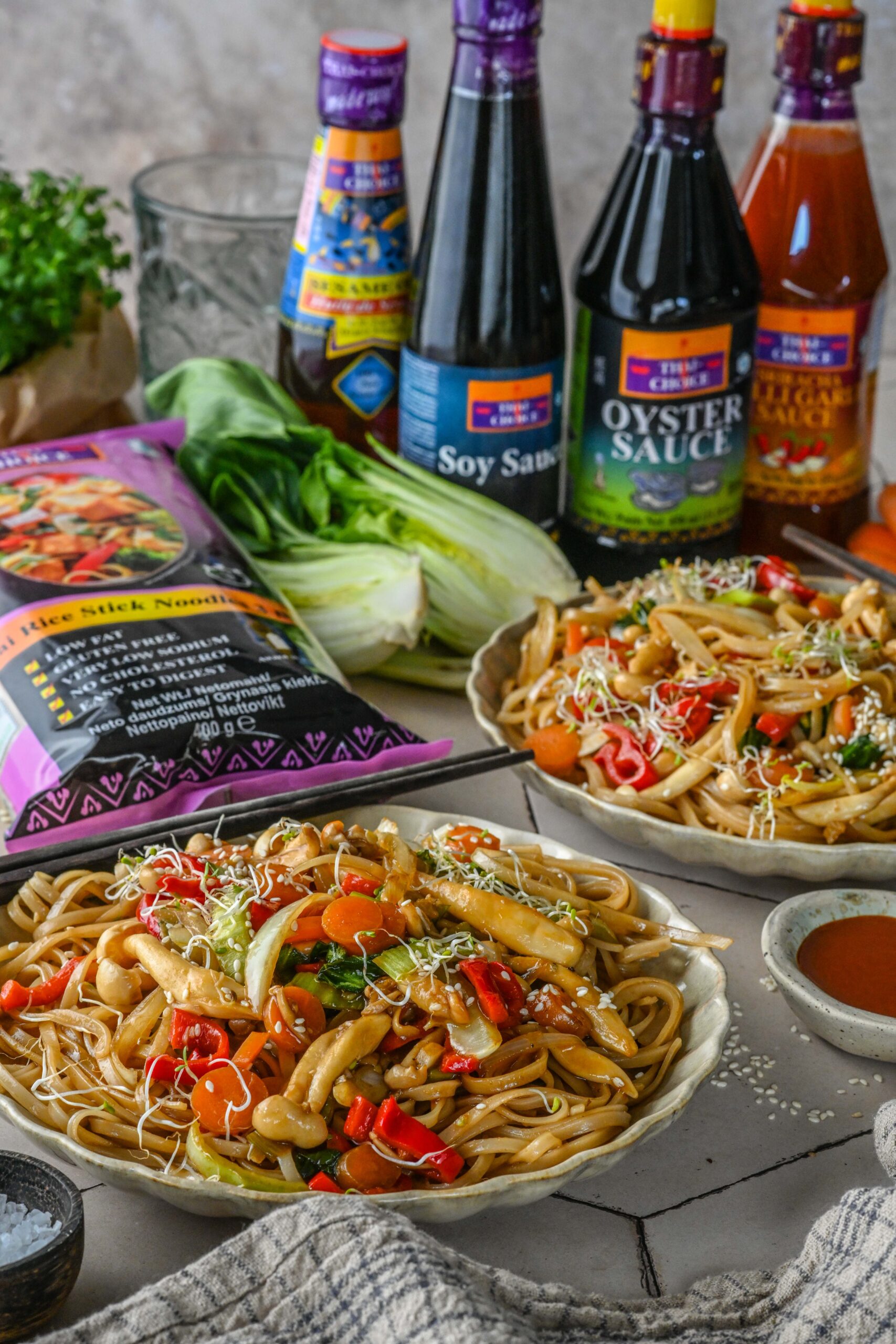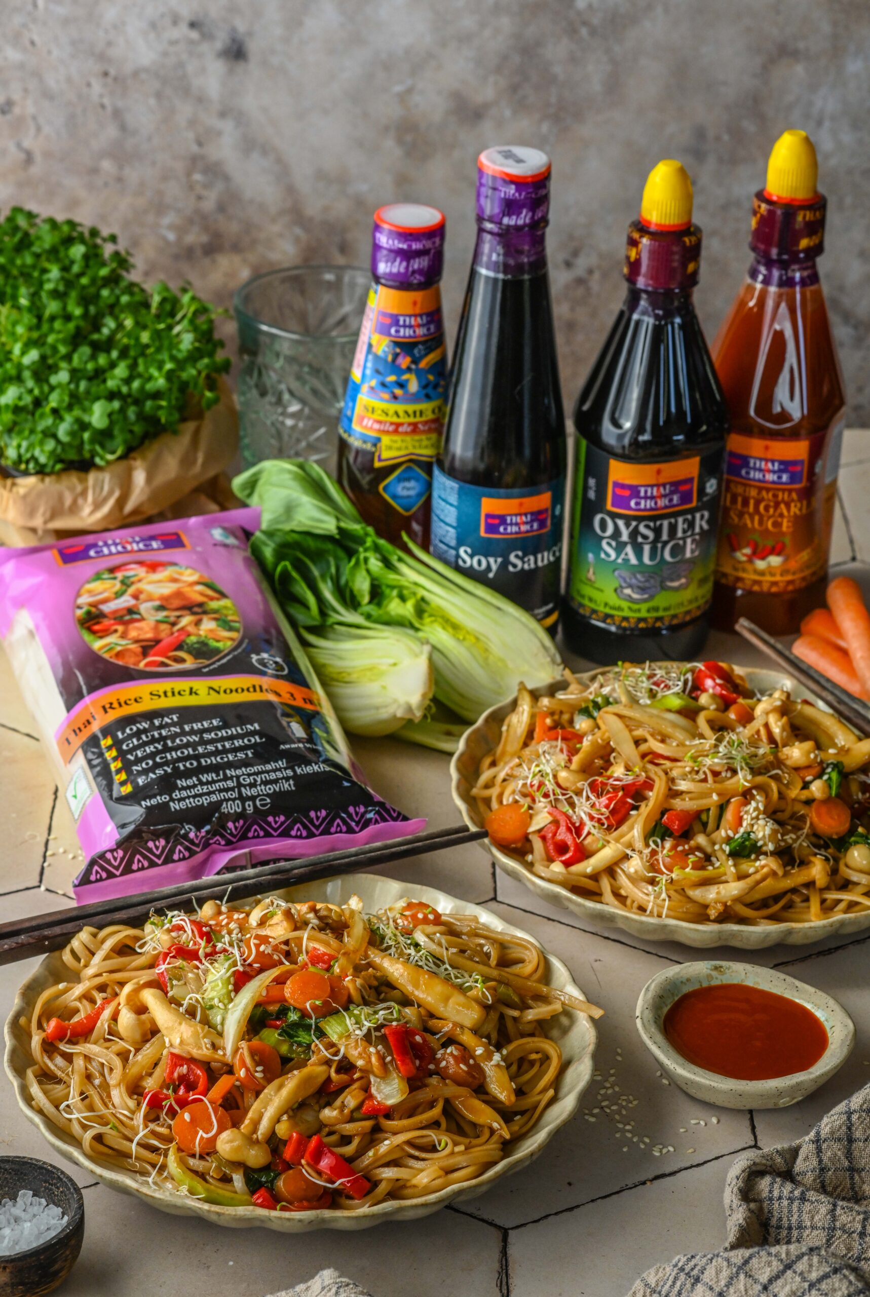 Thai Choice sarja lõigatud riisinuudleid on väga mugav kasutada, kuna nad on paraja pikkusega ja pakist saad lihtsa vaevaga vajamineva koguse välja tõsta vastavalt sööjate arvule. Kaste vokiroale sega kokku sojakastmest, austrikastmest, riisiäädikast, teravust lisa sriracha kastmega ning suitsust maitset lisa seesamiõliga. Paksenda maisitärklisega, nii jääb kaste mõnusalt paks ja kleepuv.