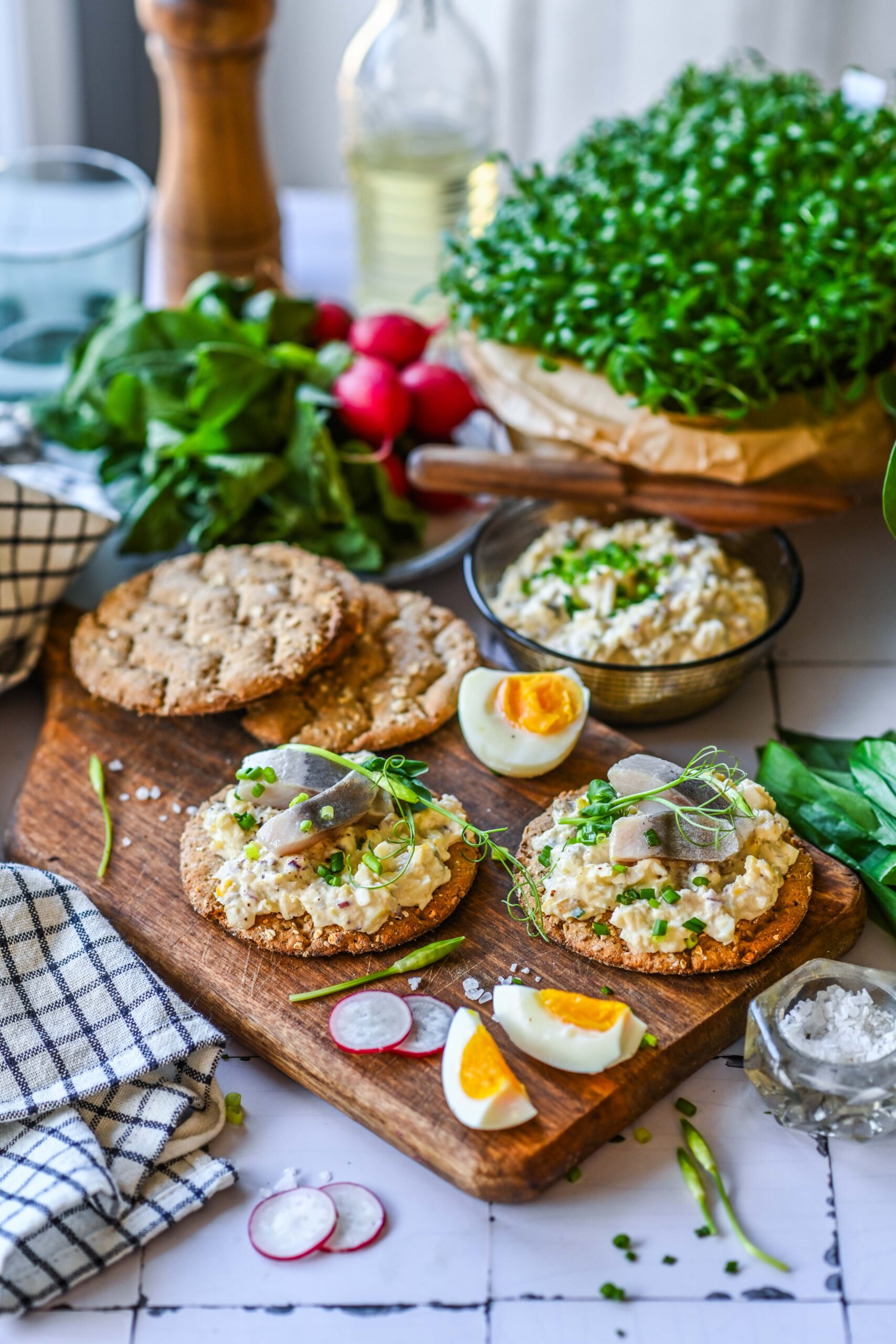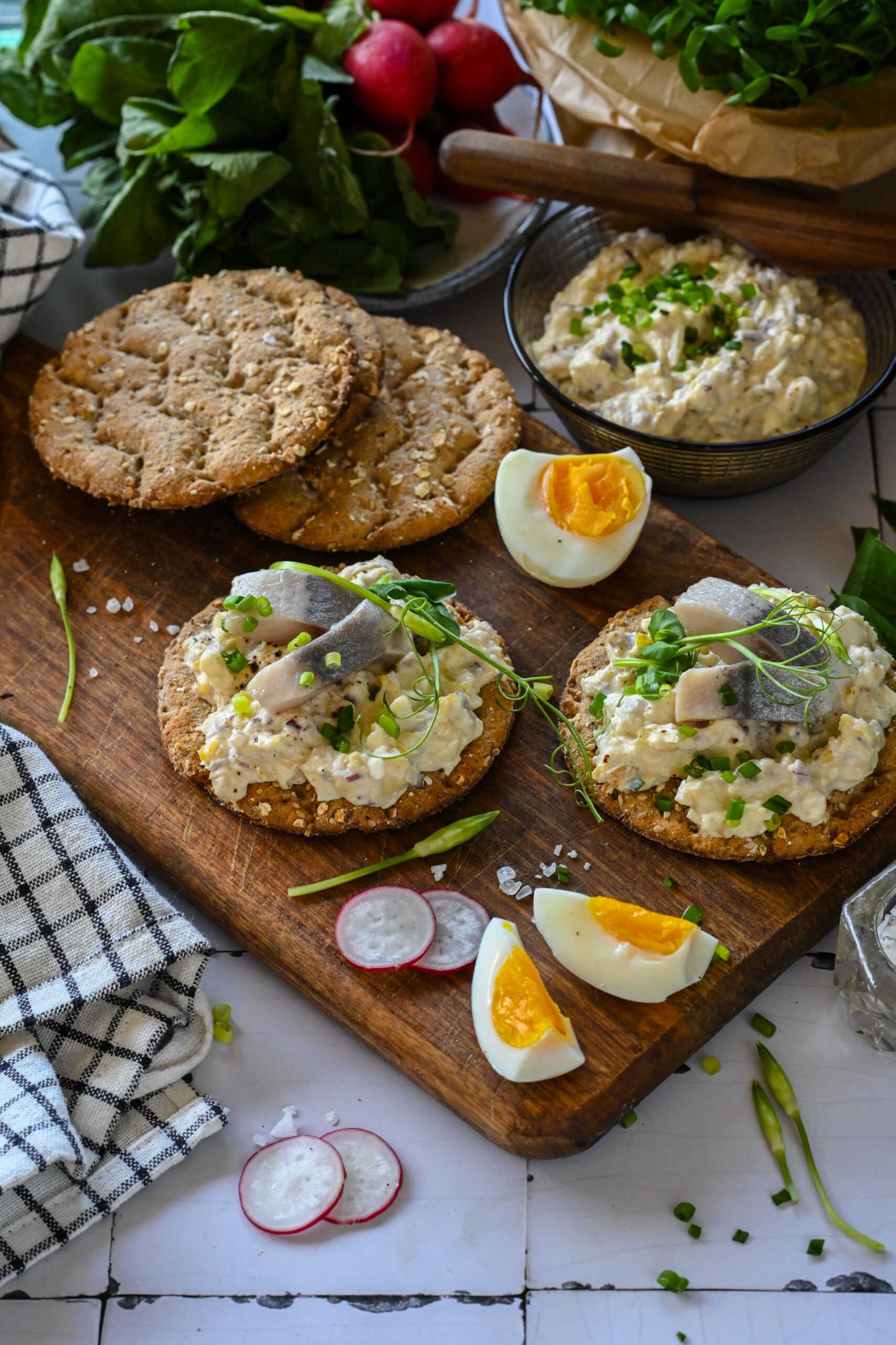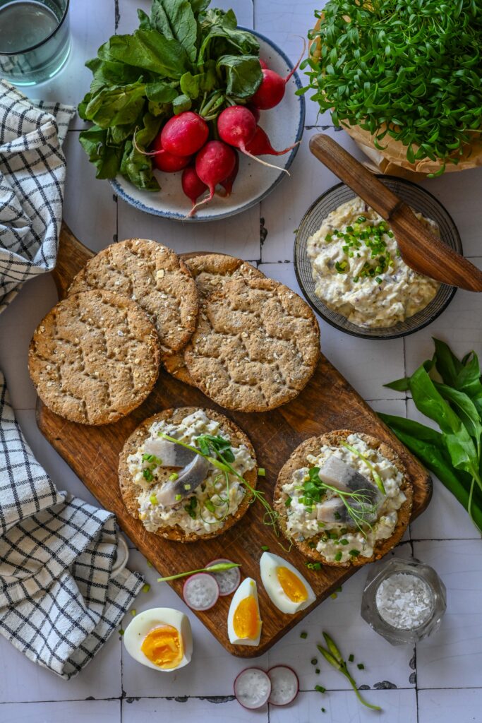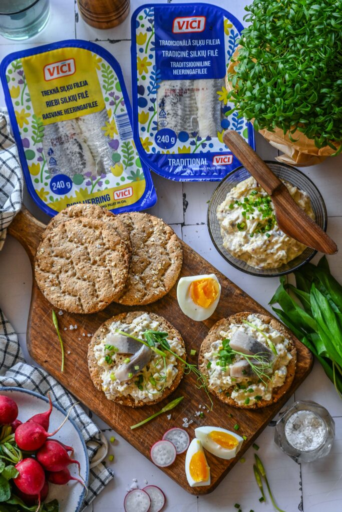 - Jaota salat näkileibadele ja kaunista hakitud murulaugu või võrsetega ning täiendavate heeringatükkidega