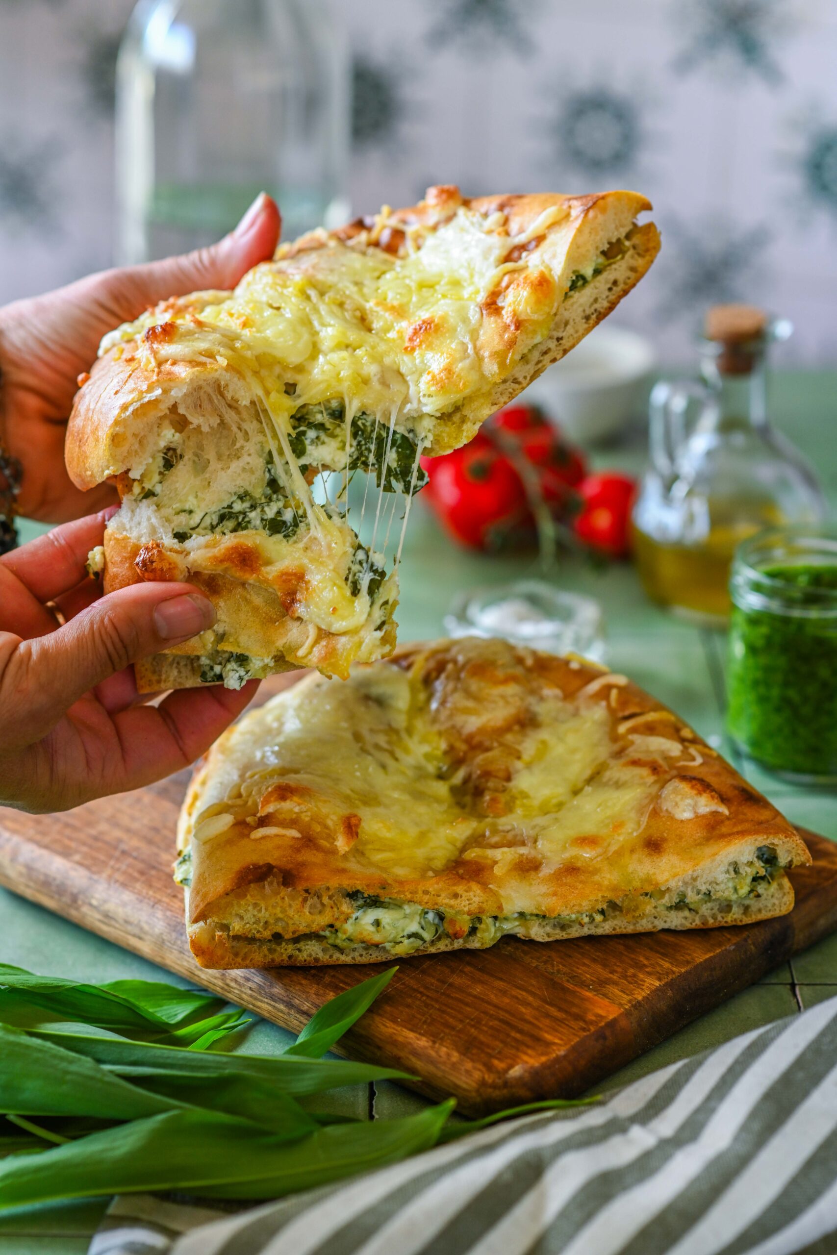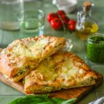 - Lõika lavašš horisontaalselt pooleks ja määri saadud segu lavaši alumisele poolele. Suru pealmine pool sinna peale. Piserda pealmist lavaši poolt õliga ning puista ka sinna riivitud juustu ja rebi mozzarellat.