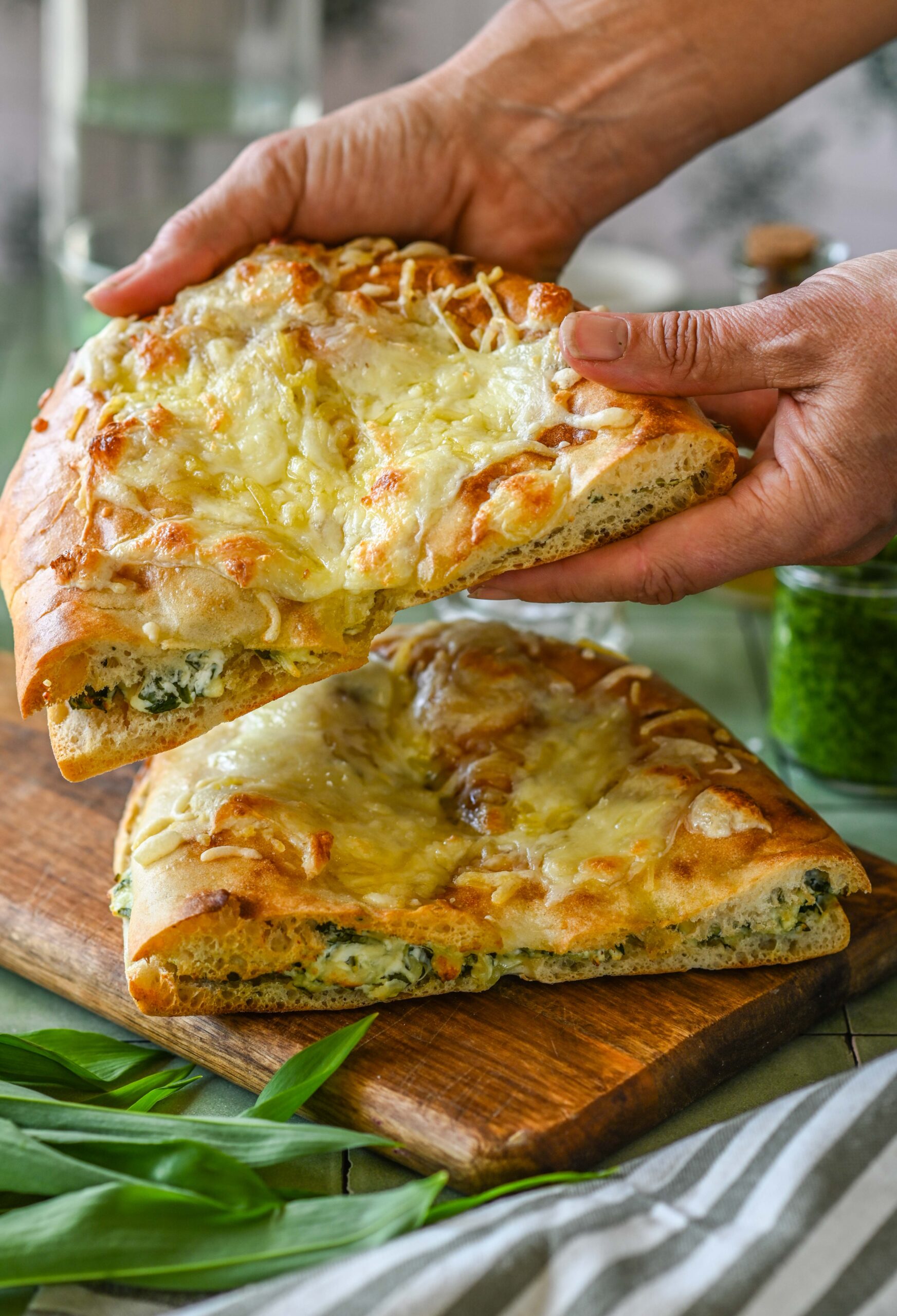 - Sega toasoe toorjuust riivitud juustu, rebitud mozzarella, hakitud karulaugu ja mõne supilusikatäie hapukoore või maitsestamata jogurtiga. Maitsesta soola ja pipraga. Segu peab jääma määritav. Vajadusel lisa täiendavalt hapukoort või jogurtit või ka majoneesi.